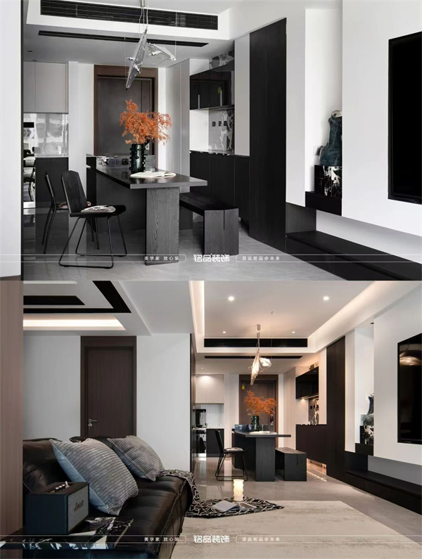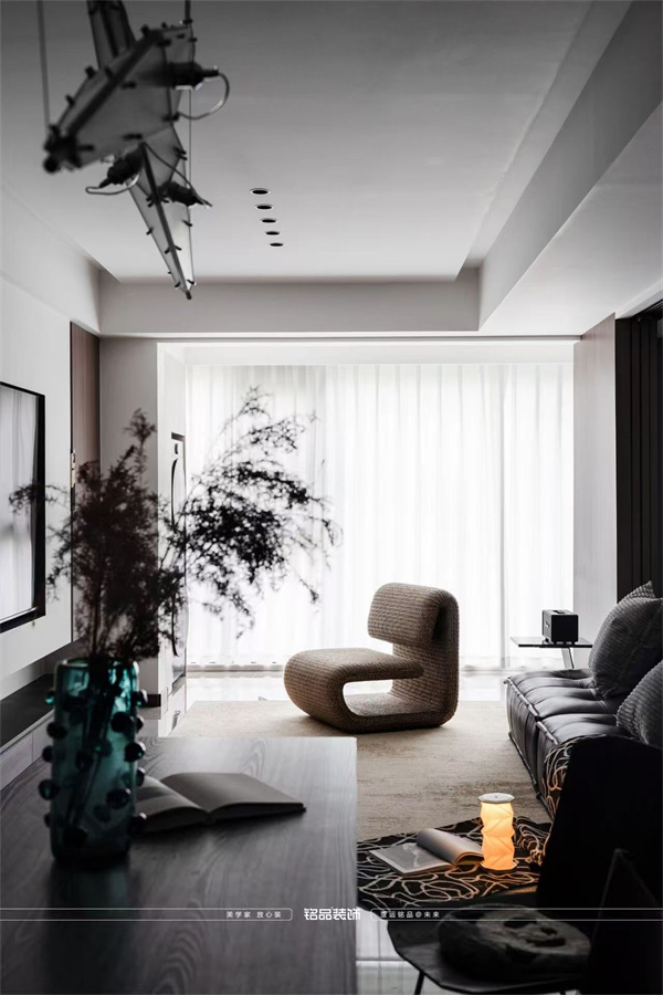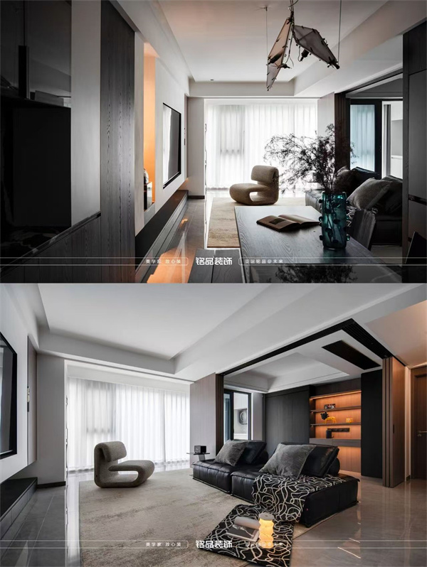 整體色調(diào)以黑白灰為主,黑色是空間的安定感,定制柜體的肌理、沙發(fā)的質(zhì)感,在光影下勾勒出利落的輪廓;白色是空間的呼吸感,融入墻面與吊頂,讓光線自由穿梭,放大了視覺(jué)上的通透;灰色則是空間色彩的調(diào)和,從地磚到地毯等軟飾,它讓黑白的碰撞多了幾分溫柔的過(guò)渡。