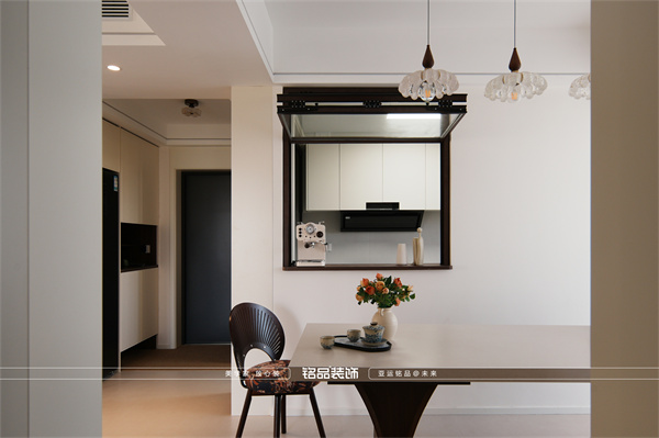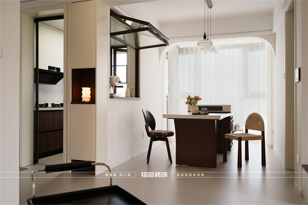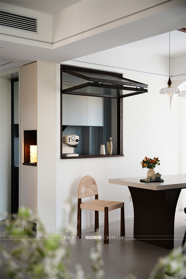 最加分的是廚房那扇小窗!傳菜不用繞路,還能和做飯的人聊聊天,互動感拉滿。墻面做了弧形處理,和客廳呼應(yīng),整個(gè)空間線條都變溫柔了。