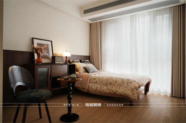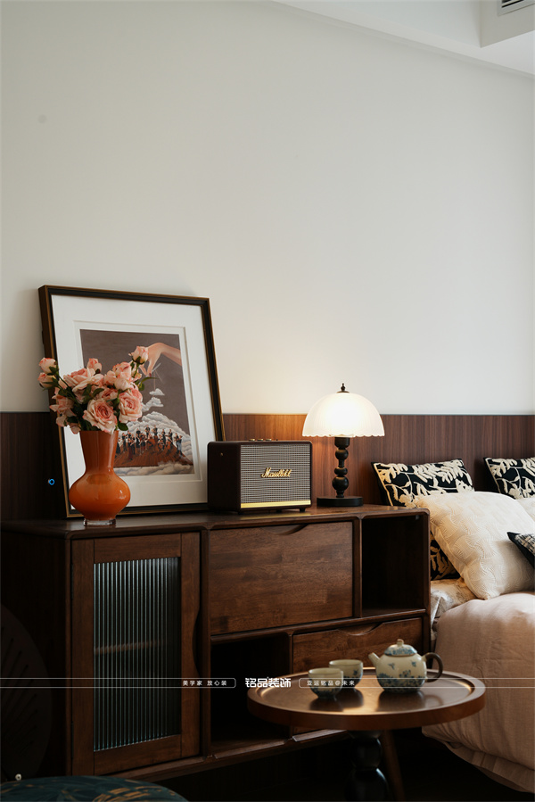 主臥背景墻是亮點(diǎn):大白墻拼接胡桃木背板,層次感瞬間出來,還省了床頭。無床頭床搭配植物花卉床品,清新不雜亂。床尾不放傳統(tǒng)床頭柜,改用胡桃木斗柜,收納展示兩不誤,顏值還超高。旁邊配兩把單人椅和小邊幾,立馬多了個(gè)愜意的休閑角落。