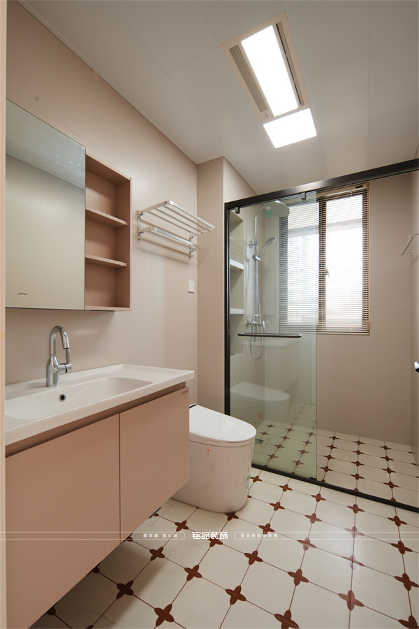 第一眼就被溫柔住了。淡粉墻搭配粉色臺盆柜,少女心拿捏得剛好,不膩反而很高級。地面小白磚上的花卉圖案是點(diǎn)睛之筆,瞬間靈動起來。