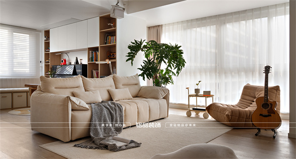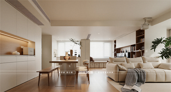 整體以橡木、白蠟?zāi)緸橹鲗?dǎo),從定制家具到墻面飾面,延續(xù)自然木紋的肌理。搭配大面積米白與暖灰基調(diào),營造出舒緩、柔和的治愈感空間。材質(zhì)與色彩的統(tǒng)一,使家如同一個包容的容器,清晰承載著居住者日常的脈絡(luò)與情緒。
