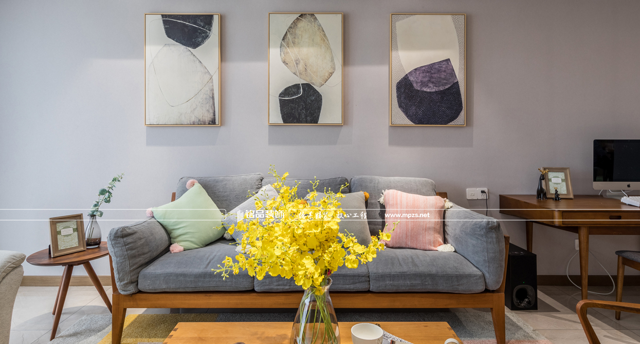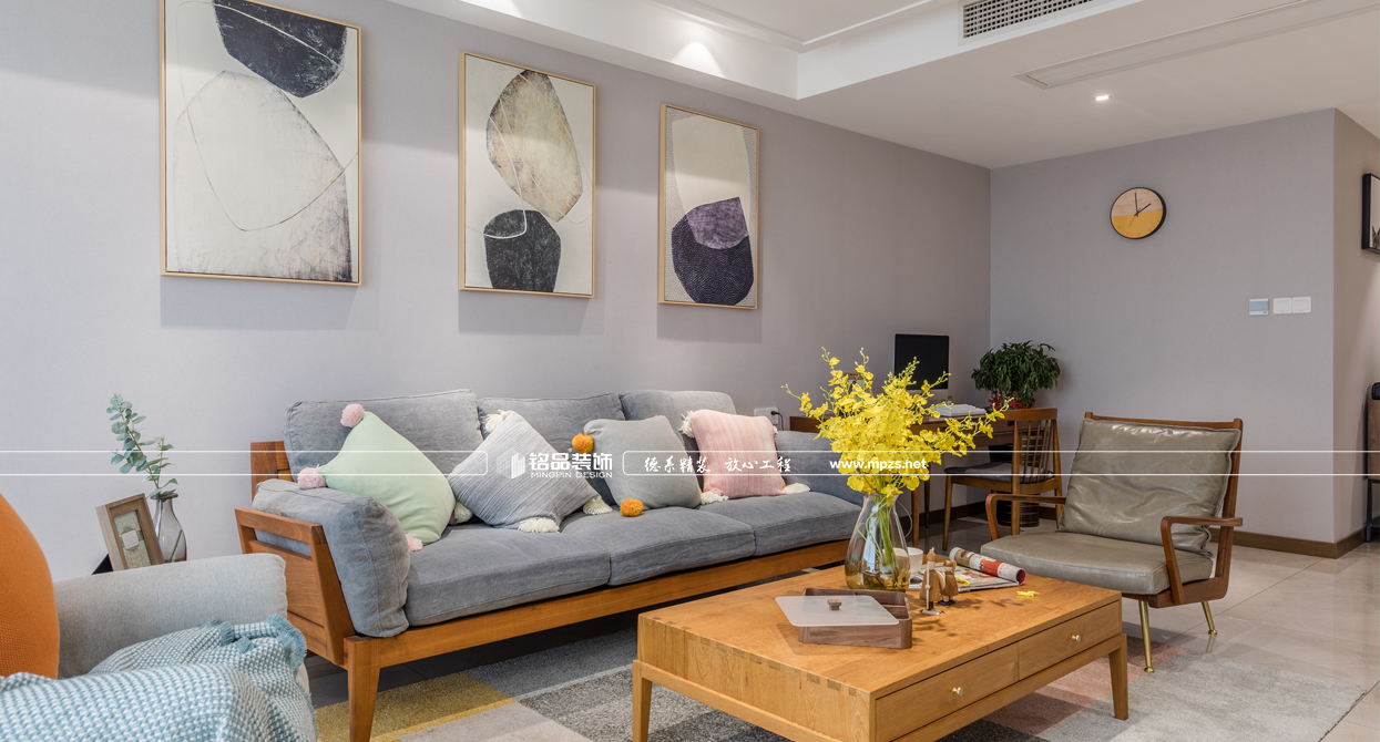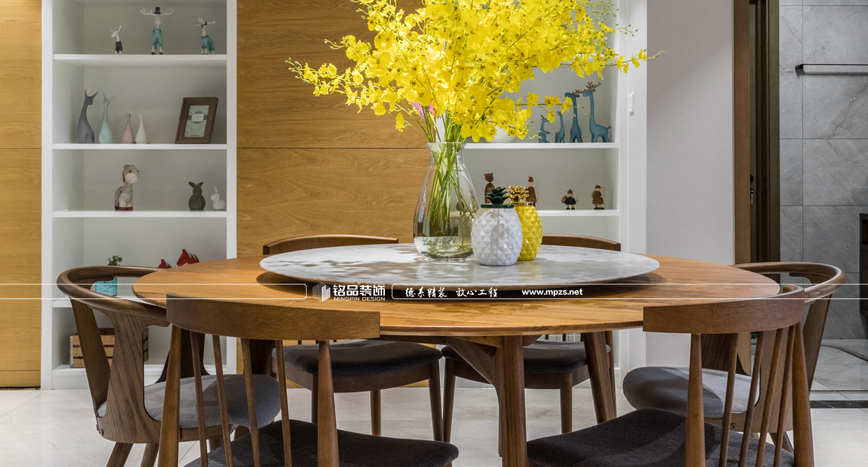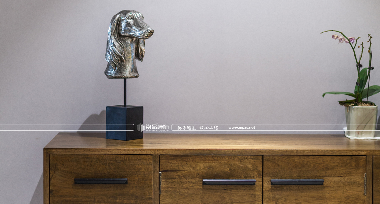 通過材質(zhì)的運用,把空間進行合理的劃分,完美呈現(xiàn)出北歐風(fēng)格的靈魂。延續(xù)硬裝設(shè)計與材質(zhì)上奠定的雅致,在沉穩(wěn)的空間基調(diào)上,植入生動的軟裝表現(xiàn)手法。以步步帶入的層疊關(guān)系逐步渲染出整個空間的格調(diào)與品質(zhì)??蛷d大面積大灰白石材背景的利用,增加了空間的層次感,墻面掛裝飾畫使墻面看起來不會過于蒼白,更加生動豐富,優(yōu)雅又有藝術(shù)氣息,提升格調(diào),讓空間中的重點之處富有活力,固定式的石材地臺取代傳統(tǒng)的電視柜給人以簡約大氣感覺,整個空間以灰調(diào)做底配上原木系家具,使整個房子生動而富有情感,讓身心放松自在。
