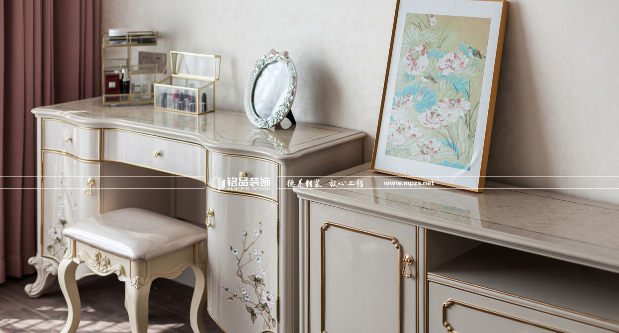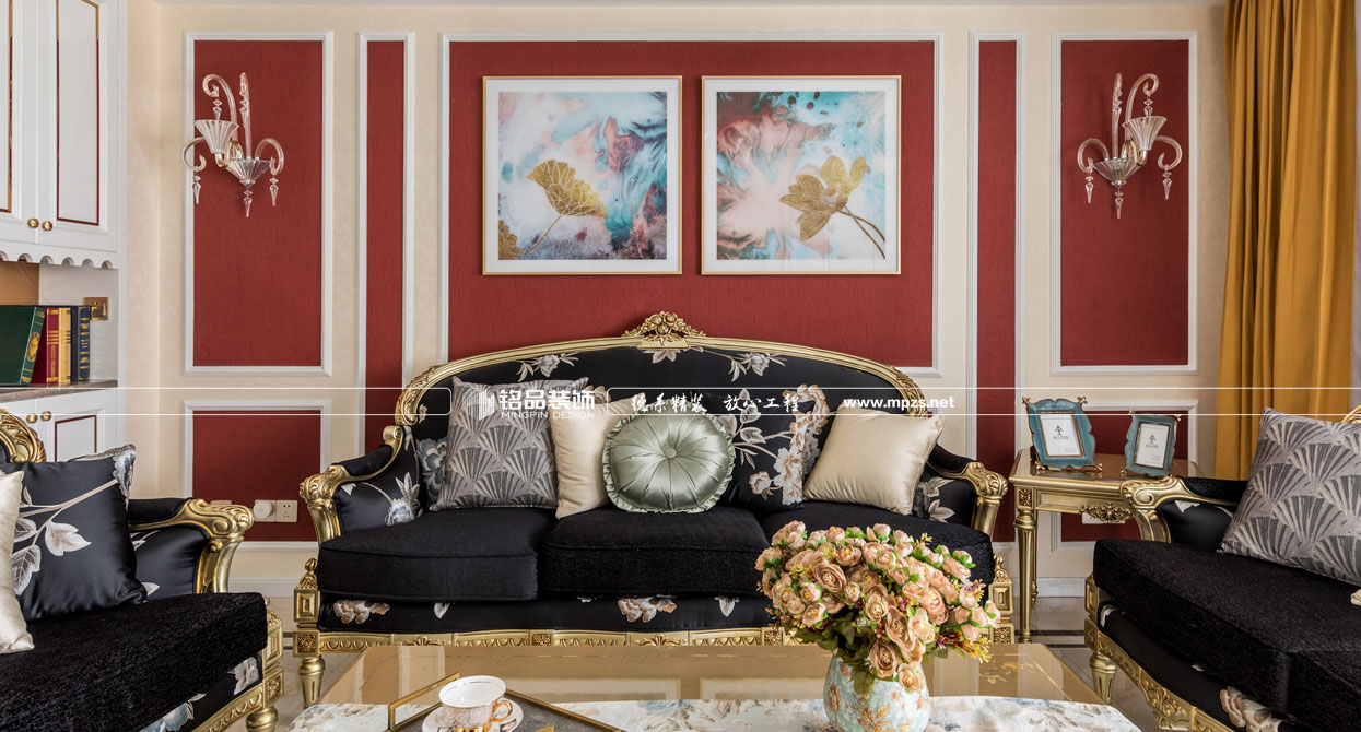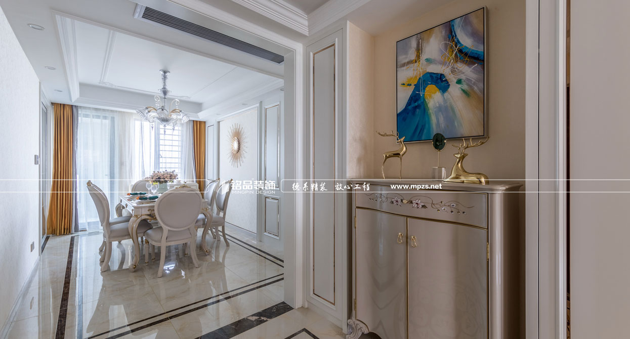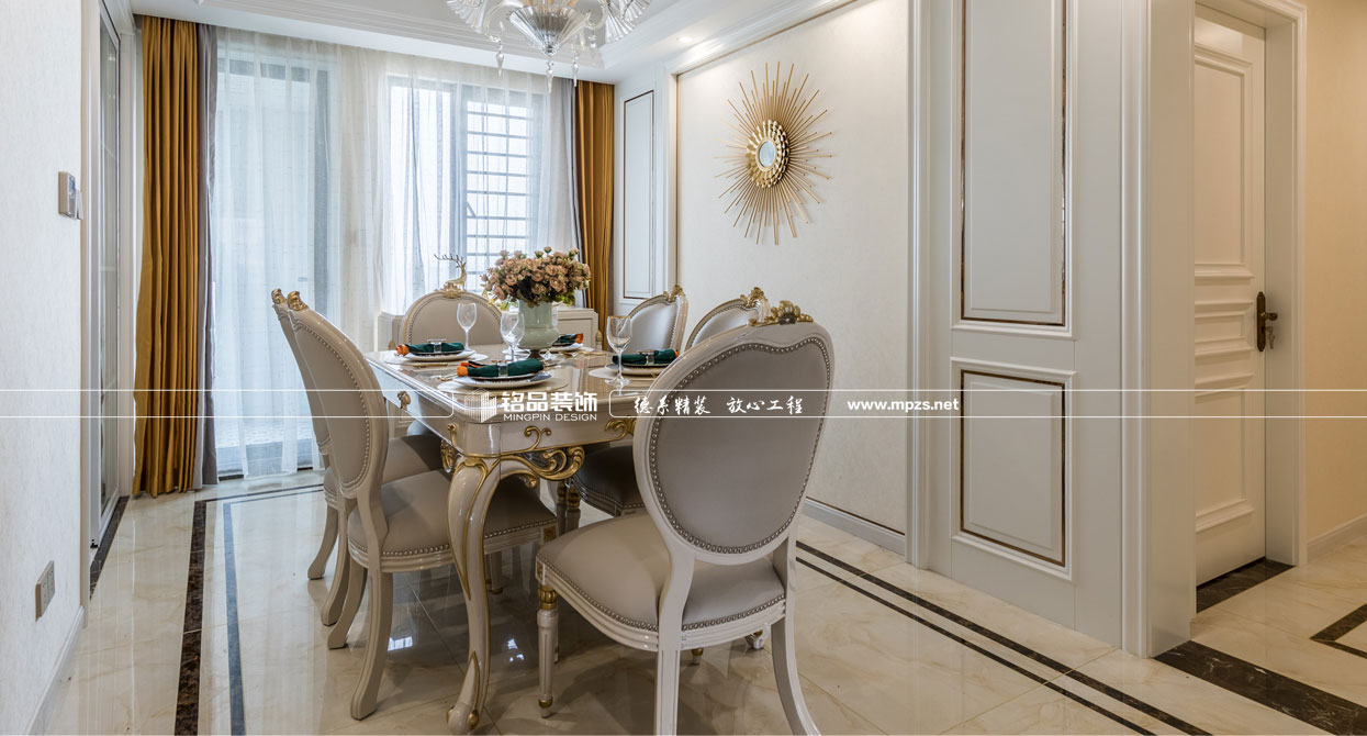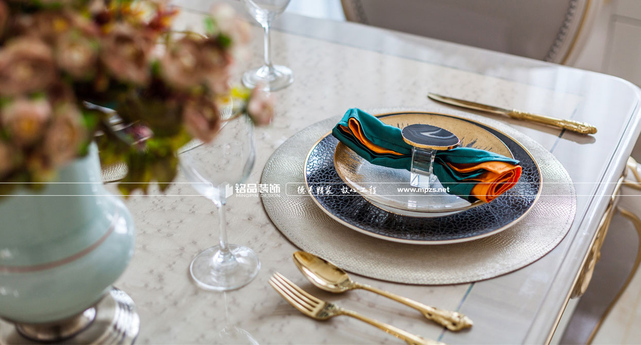 同樣的復(fù)古情調(diào),不一樣的味道??蛷d色調(diào)以米黃色為基底,玫瑰金的線條點綴,整面流線造型的沙發(fā)背景墻,給雅靜的空間帶來生機。餐廳,運用頂上雕花線與金屬欠條護墻裝飾空間,線條的運用像一條完美的分割線,發(fā)掘了整個空間細膩華麗的風采