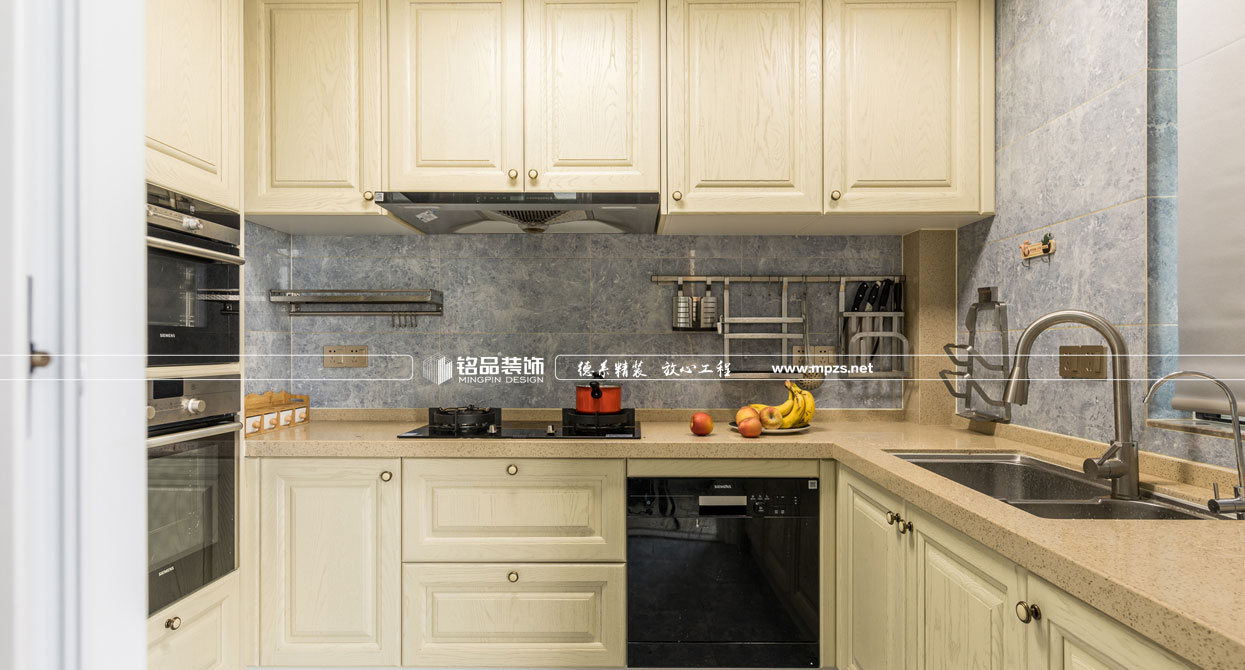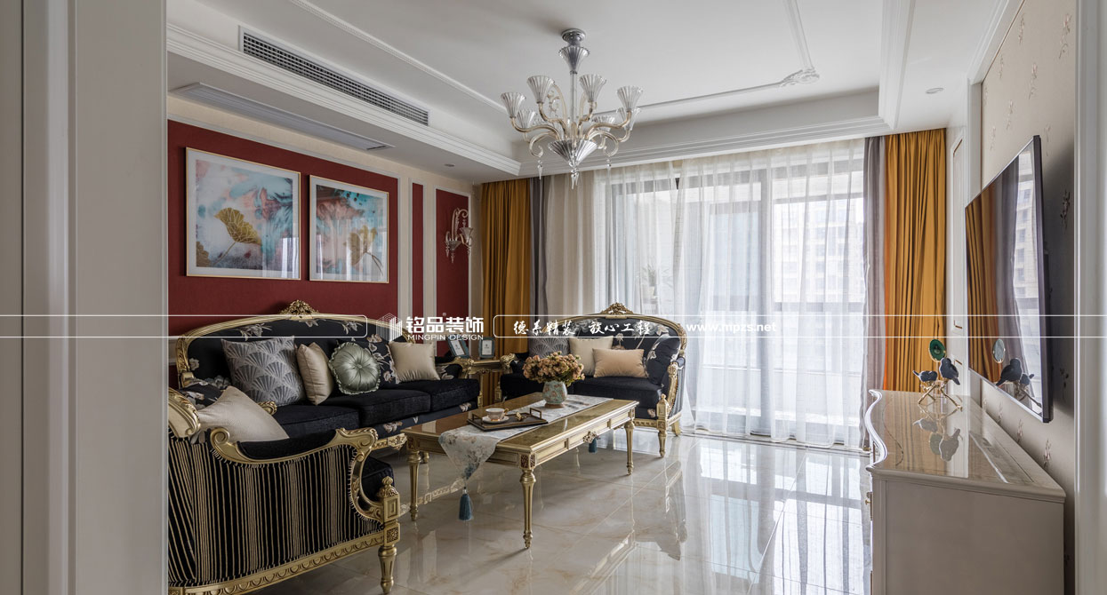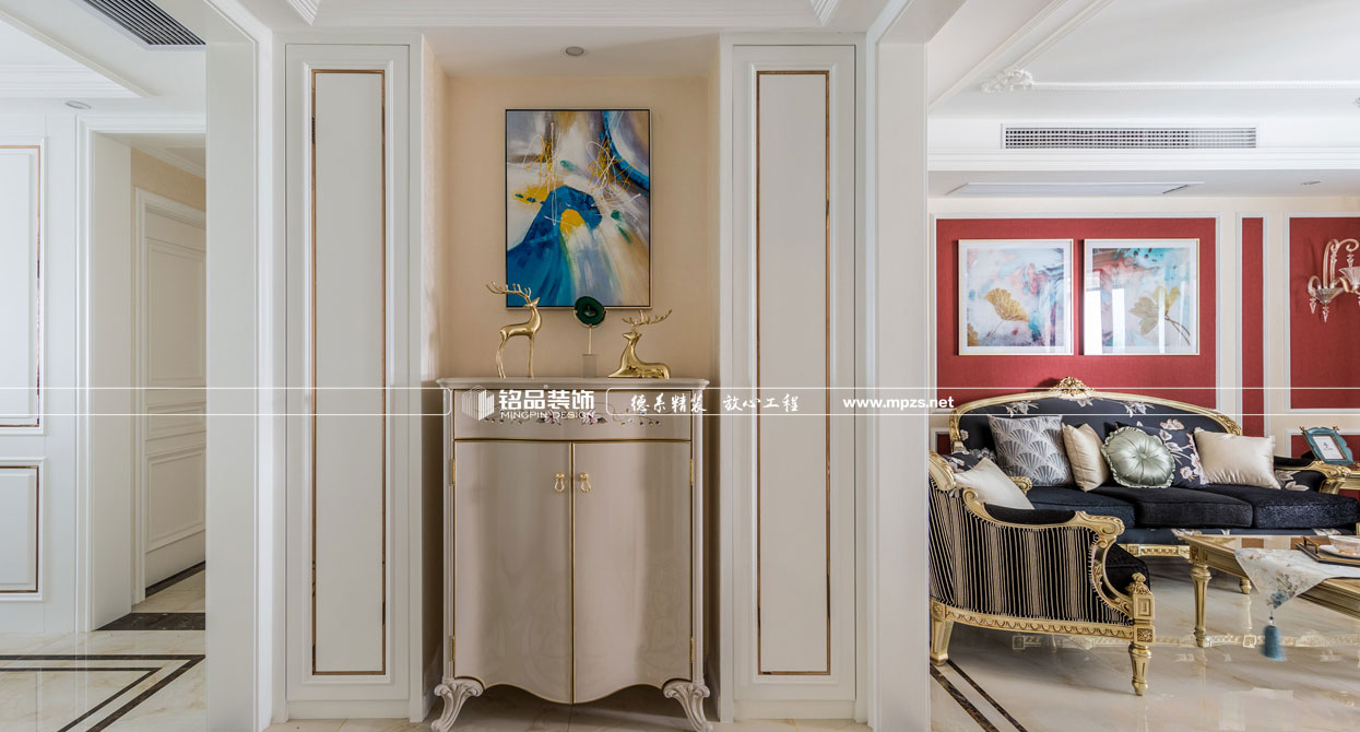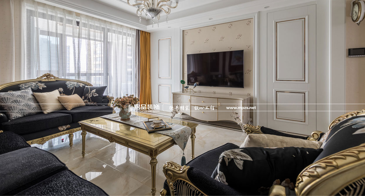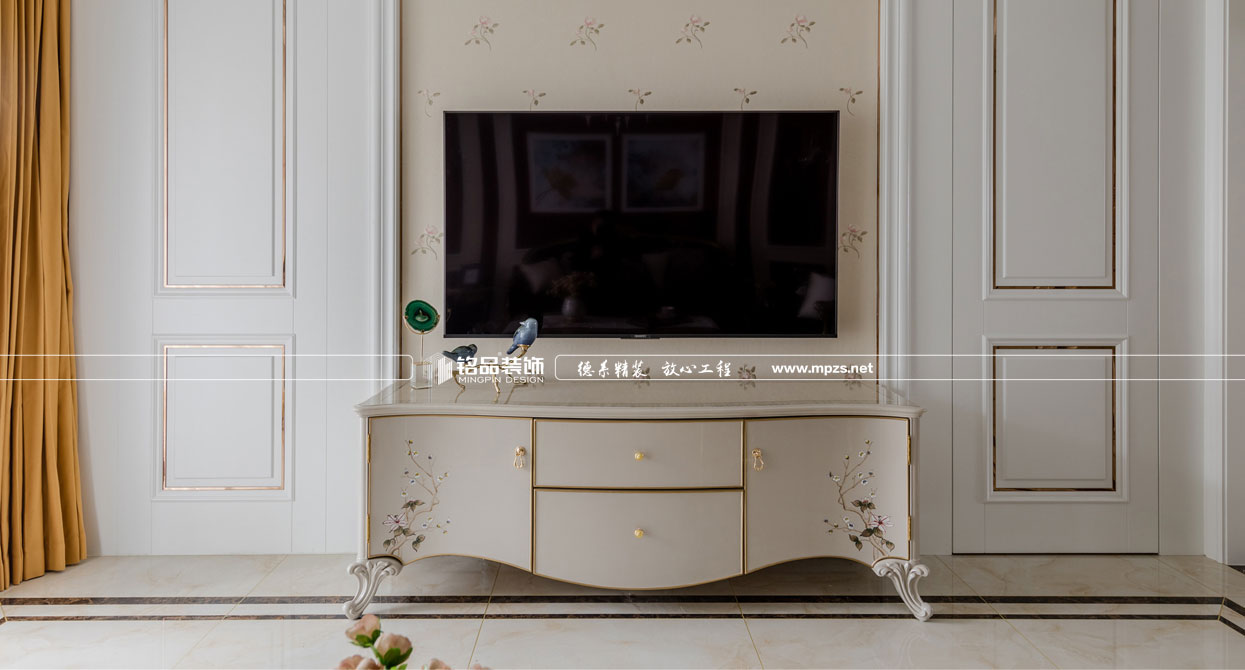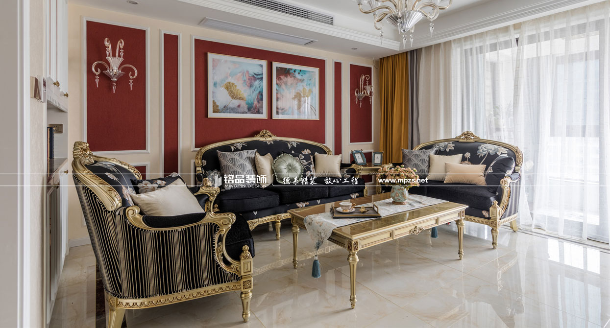 同樣的復(fù)古情調(diào),不一樣的味道??蛷d色調(diào)以米黃色為基底,玫瑰金的線條點綴,整面流線造型的沙發(fā)背景墻,給雅靜的空間帶來生機。餐廳,運用頂上雕花線與金屬欠條護墻裝飾空間,線條的運用像一條完美的分割線,發(fā)掘了整個空間細膩華麗的風采