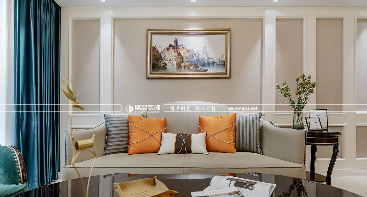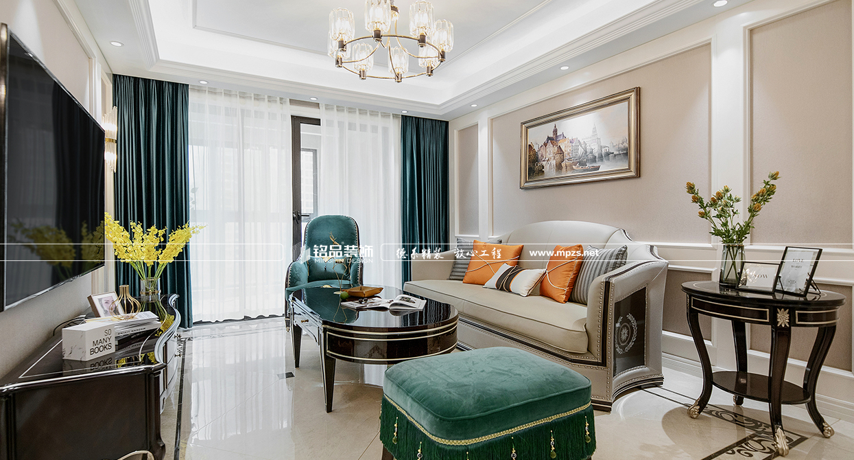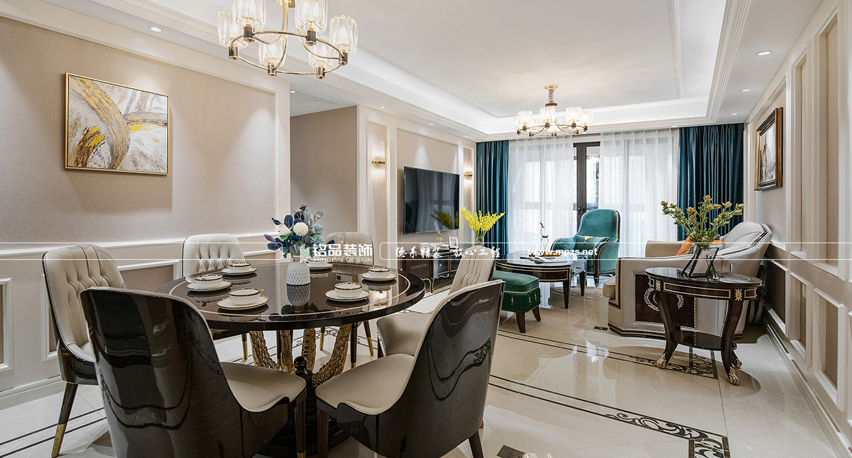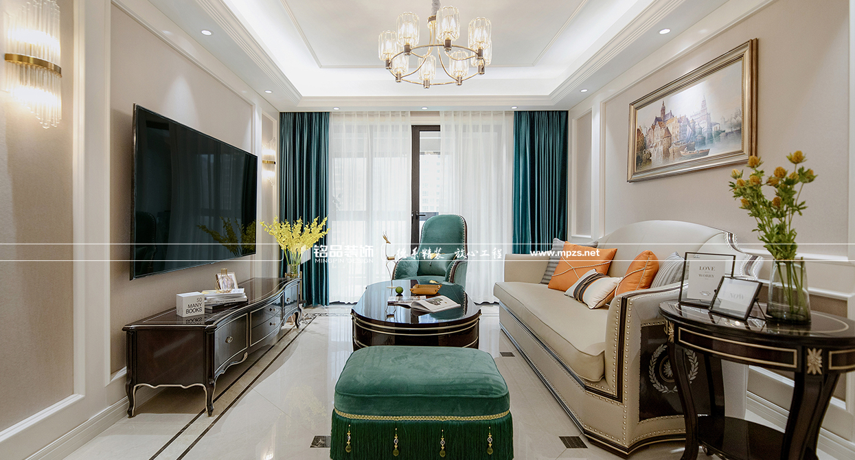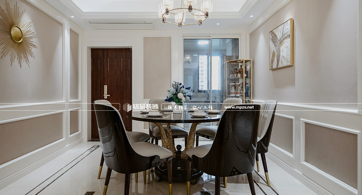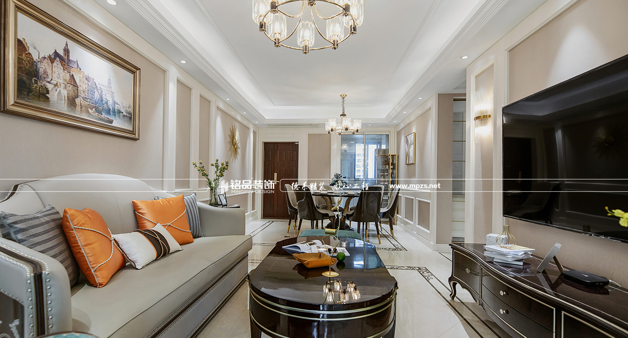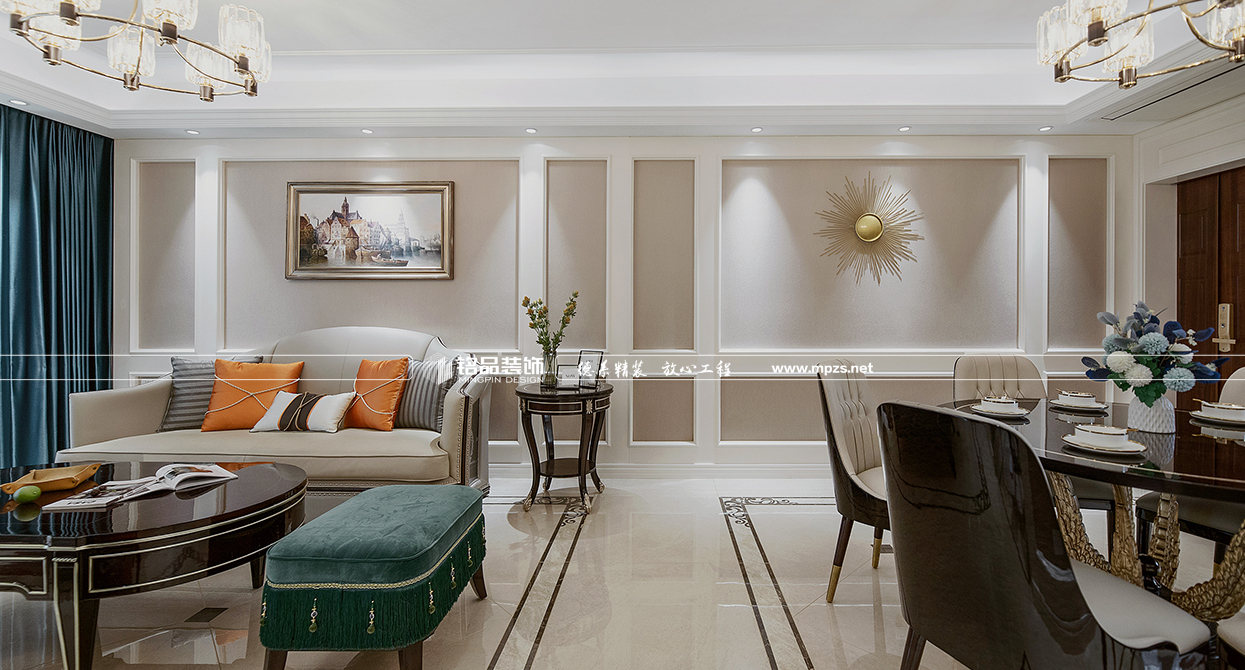 本案例房屋面積為105㎡,以美式風(fēng)格裝修為主,色系以米色作為空間的主色,加以金屬色點綴,使空間整體溫馨而又不失奢華,客廳筒燈加主燈設(shè)計使空間光線最大化,提升空間通透感