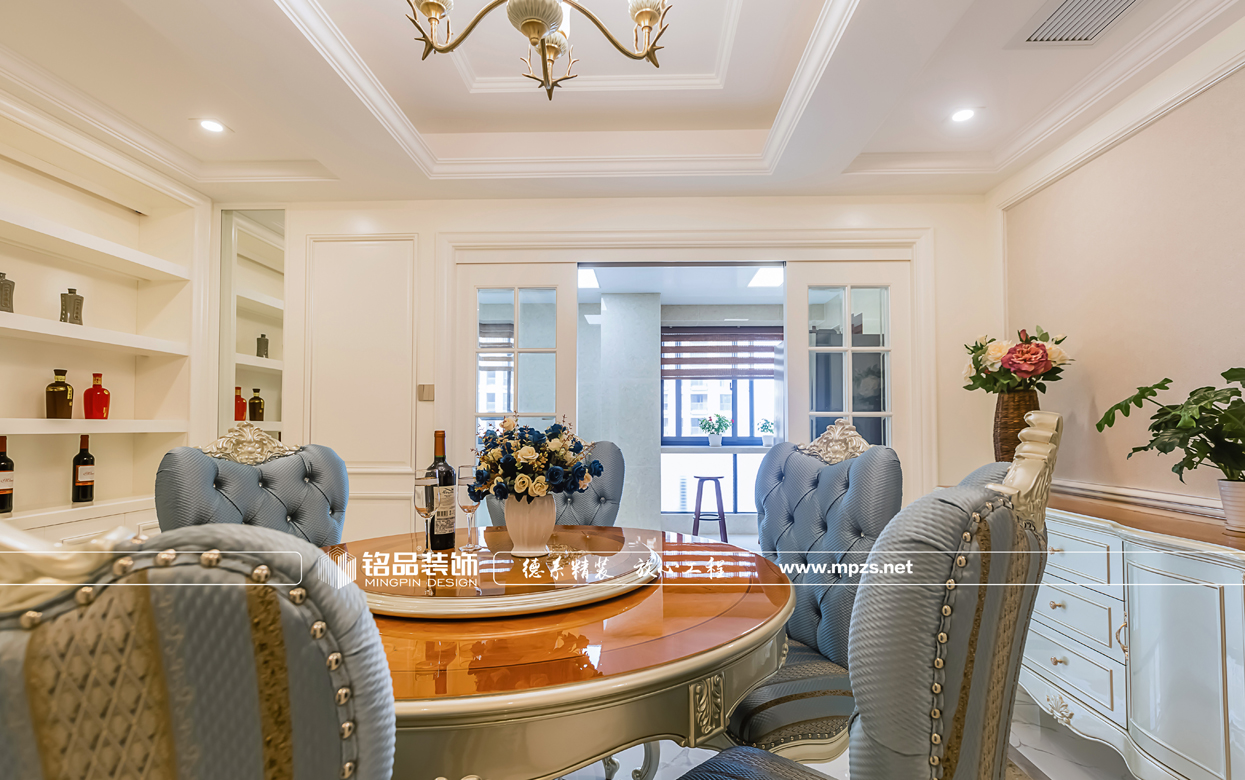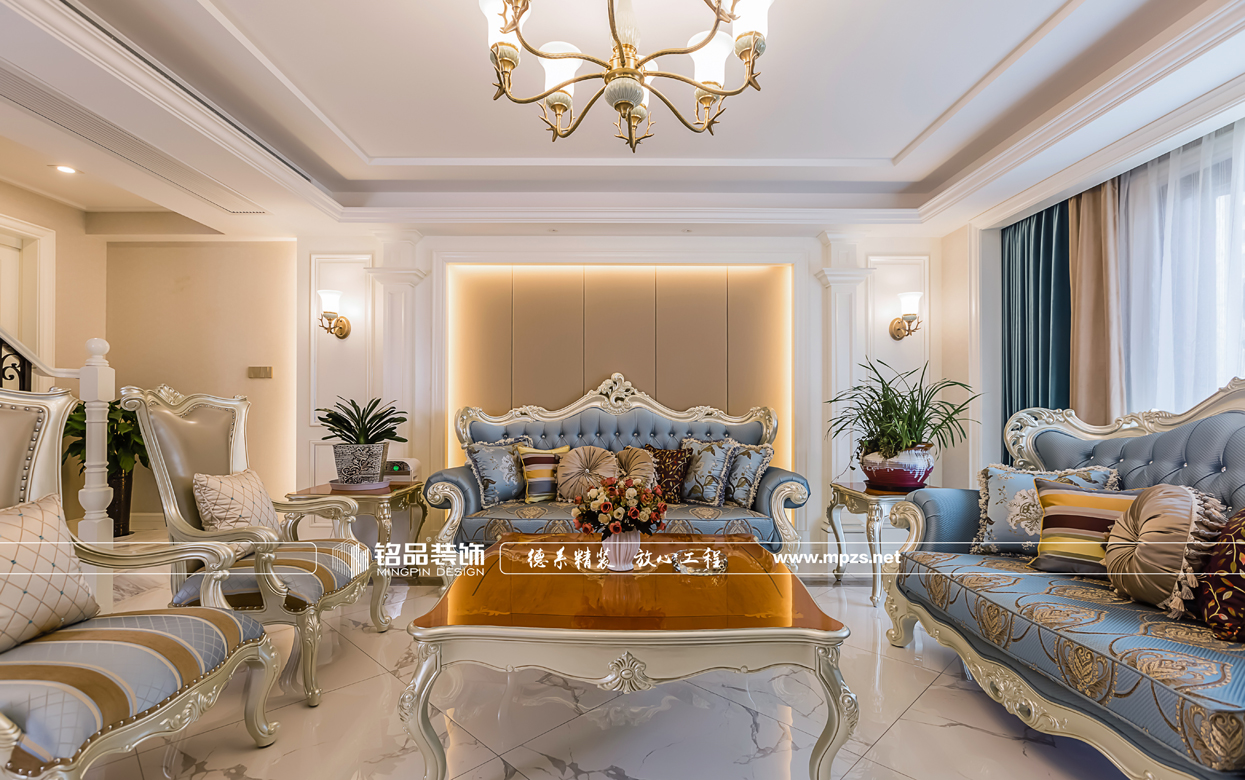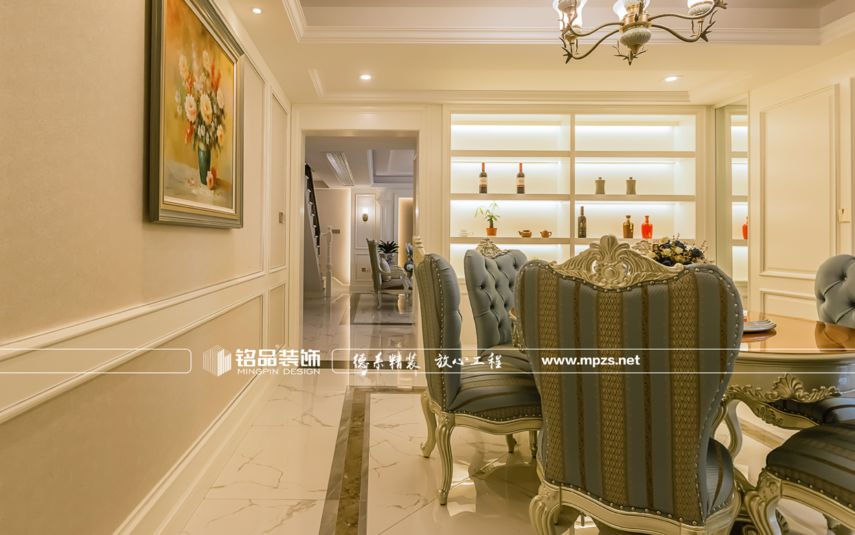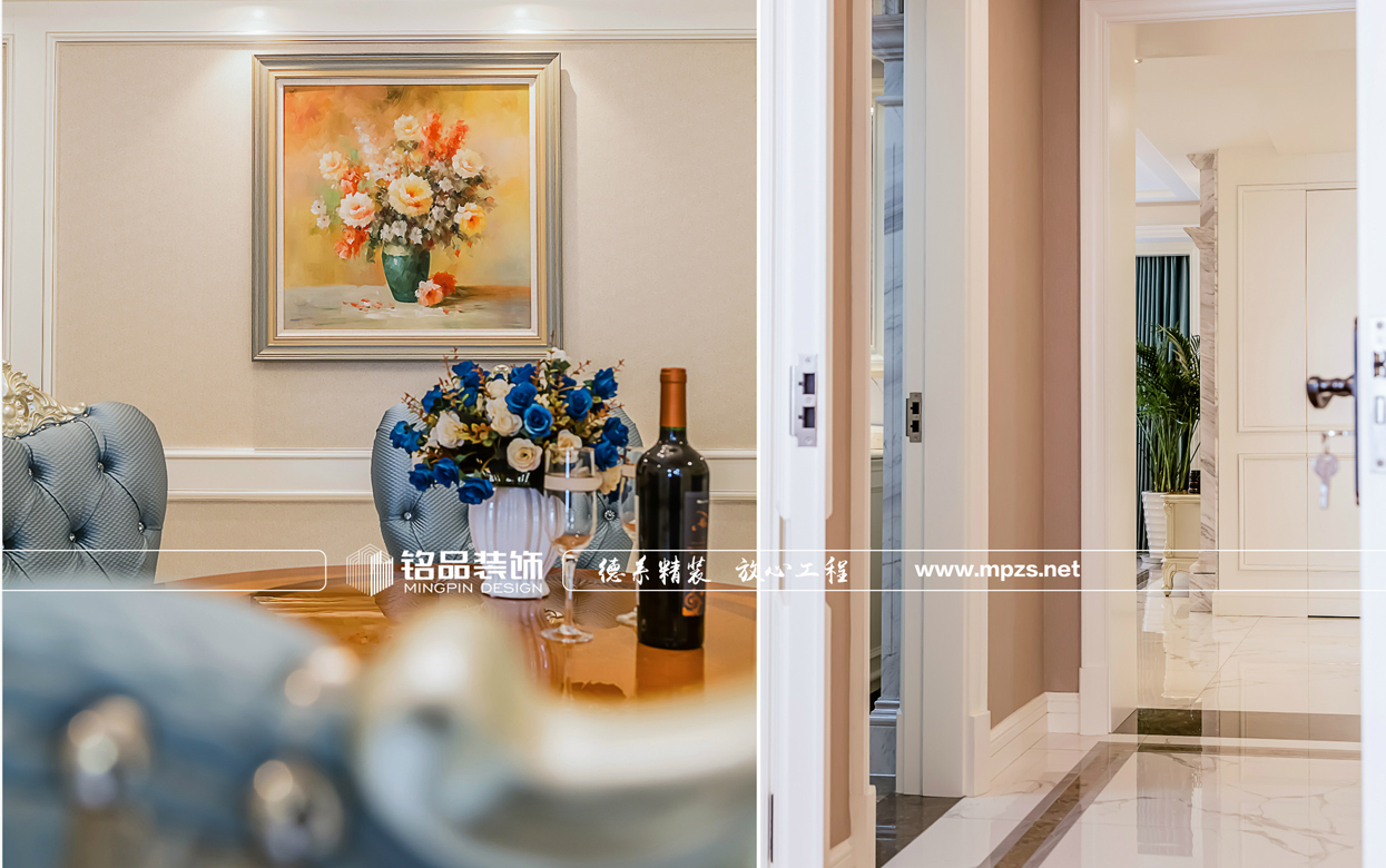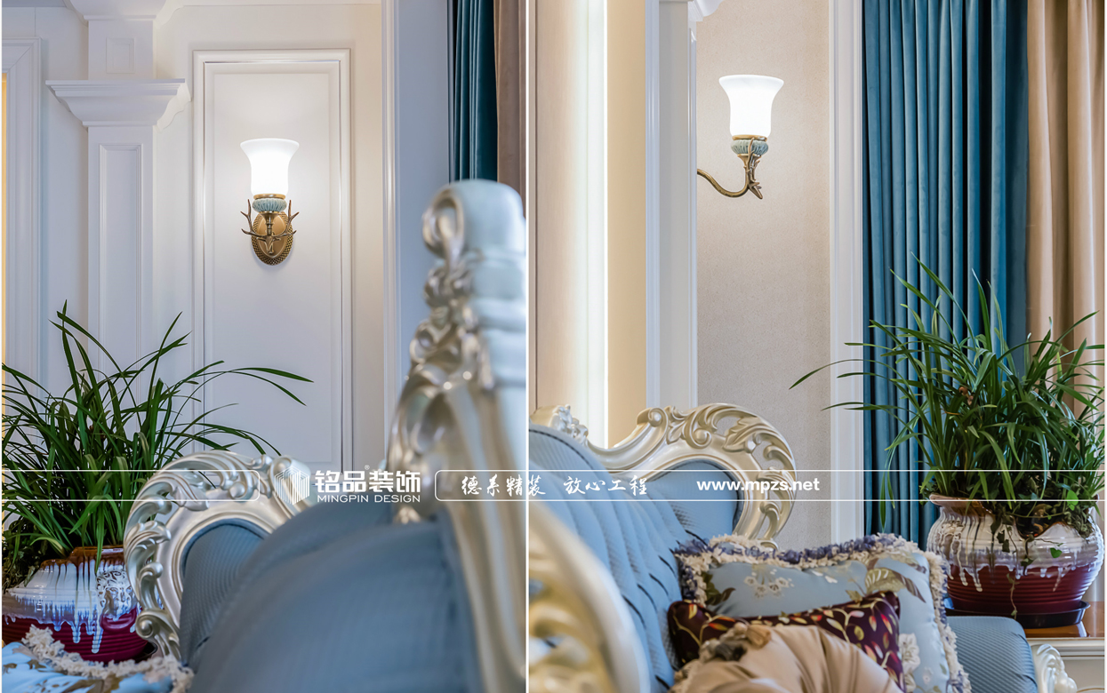 作品的最大的亮點是“形散而神聚” 墻壁大面積的白色和金色,配合暗藍色的沙發(fā),酒紅色的茶幾,整個色調(diào)看起來明亮大方,藍色和金色的窗簾遙相呼應(yīng),其中水晶宮燈和羅馬古柱都是點睛之筆,餐廳墻壁上的油畫,臥室的臺燈,讓人們有古典優(yōu)雅與從容的感覺,透過白色的沙曼,陽光傾灑在深色的木地板上, 與粉色的床品形成一幅和諧溫馨家的感覺