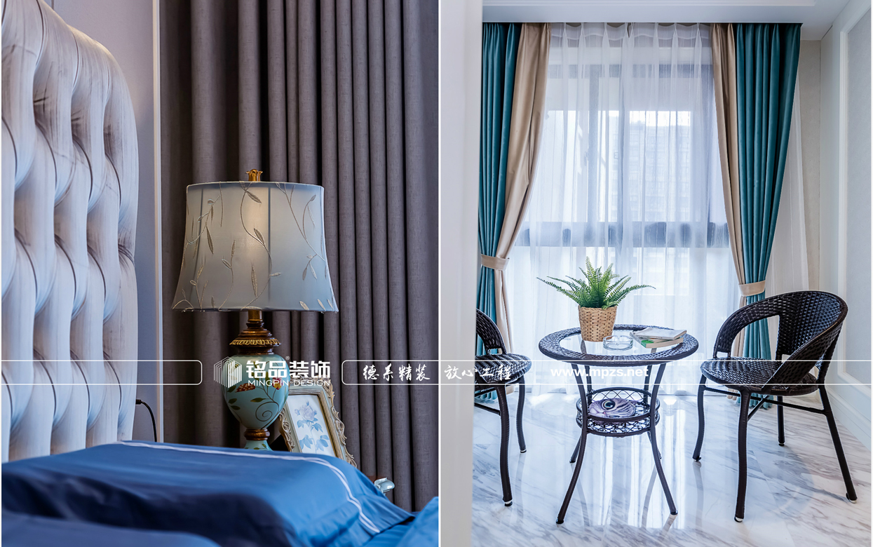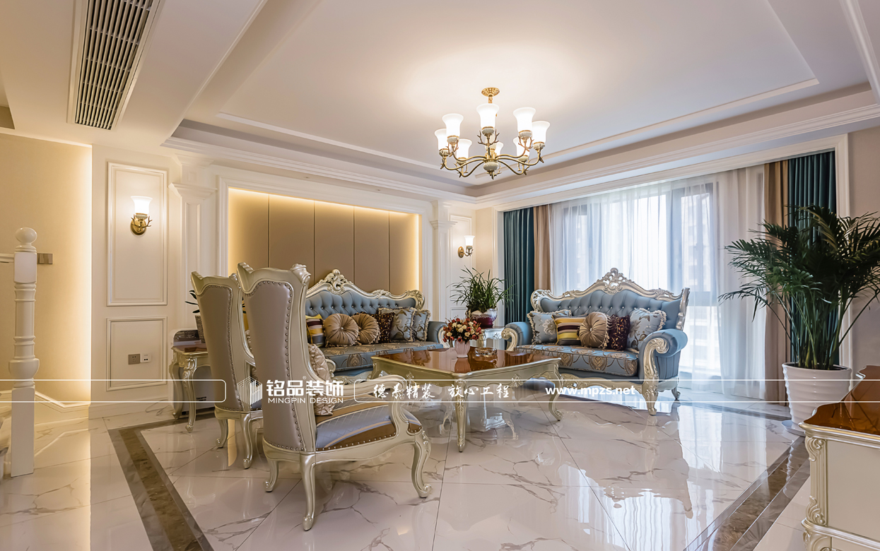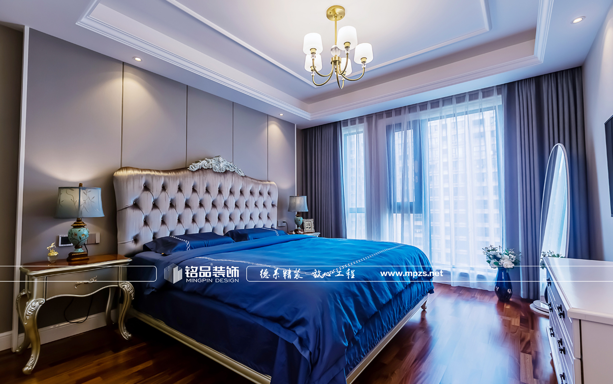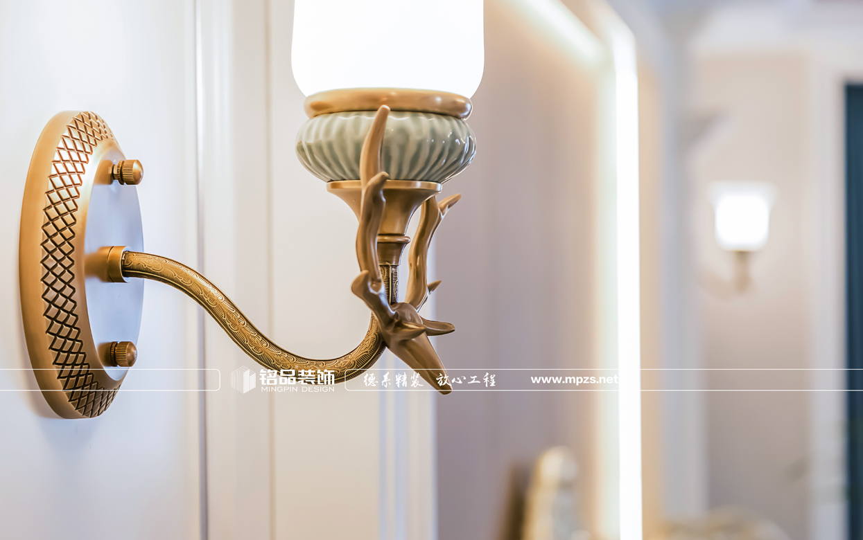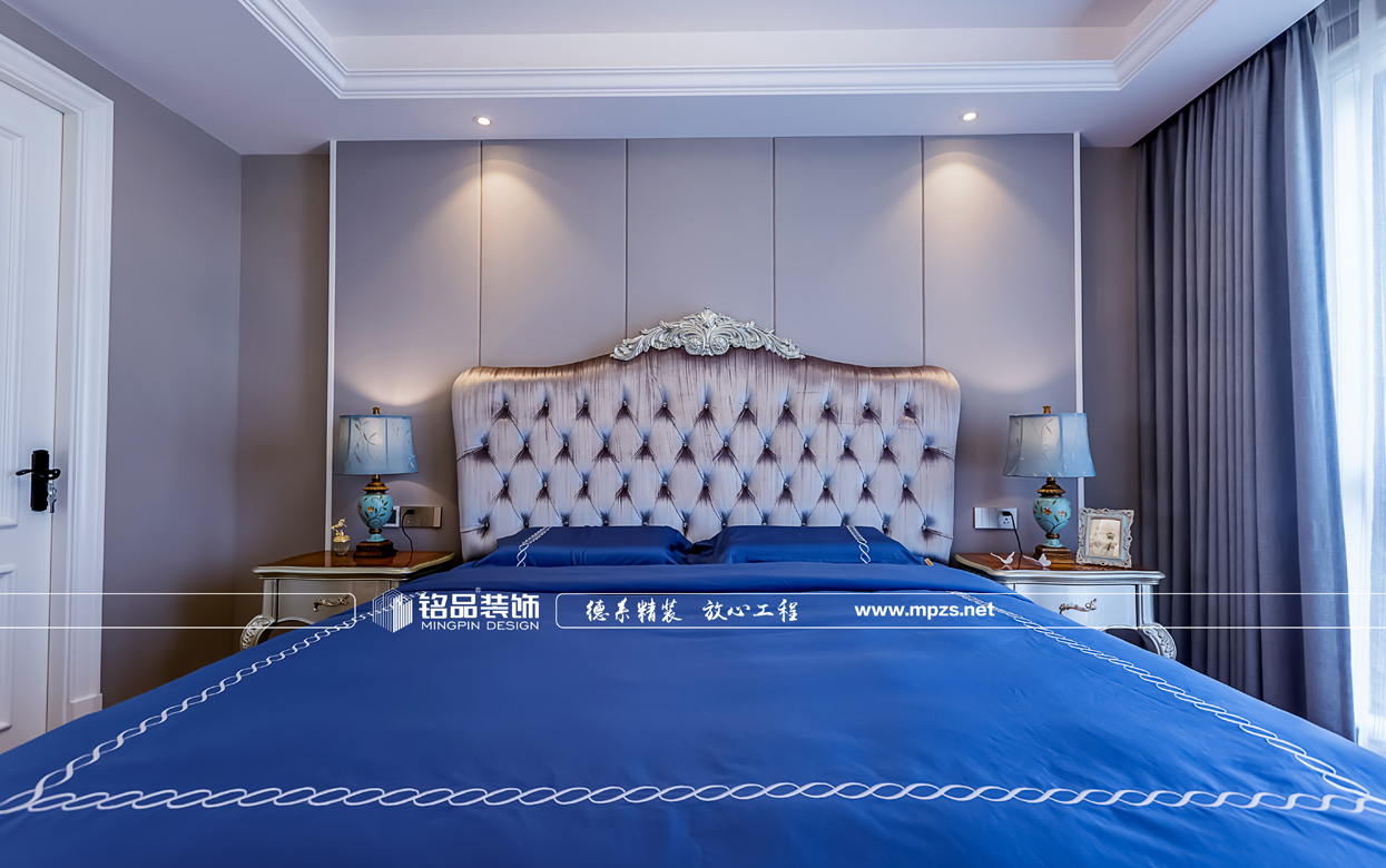 作品的最大的亮點是“形散而神聚” 墻壁大面積的白色和金色,配合暗藍色的沙發(fā),酒紅色的茶幾,整個色調(diào)看起來明亮大方,藍色和金色的窗簾遙相呼應(yīng),其中水晶宮燈和羅馬古柱都是點睛之筆,餐廳墻壁上的油畫,臥室的臺燈,讓人們有古典優(yōu)雅與從容的感覺,透過白色的沙曼,陽光傾灑在深色的木地板上, 與粉色的床品形成一幅和諧溫馨家的感覺