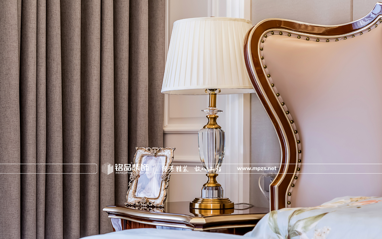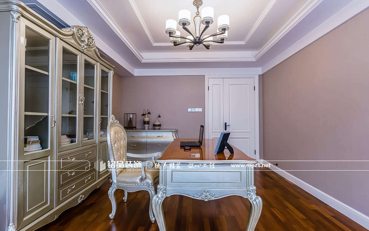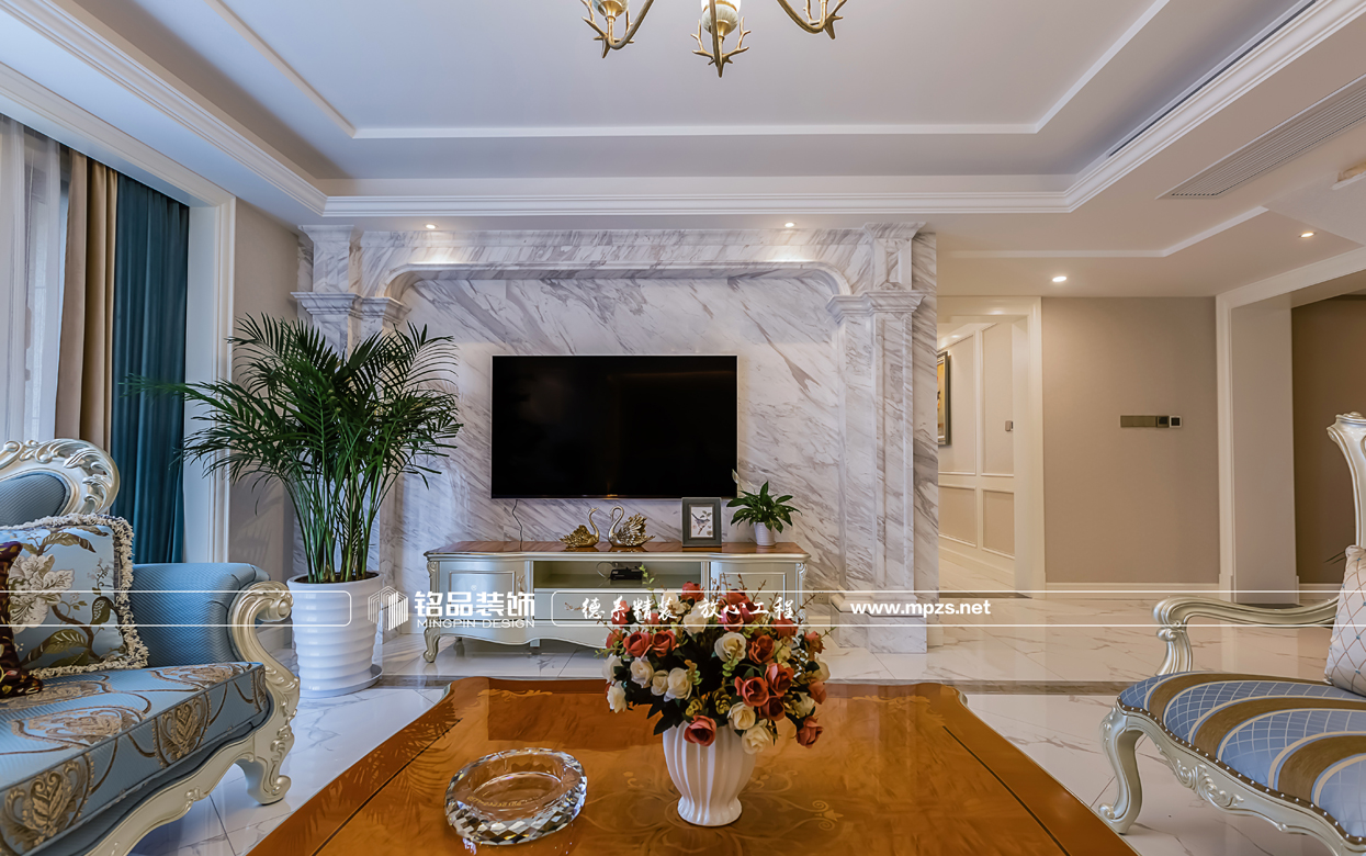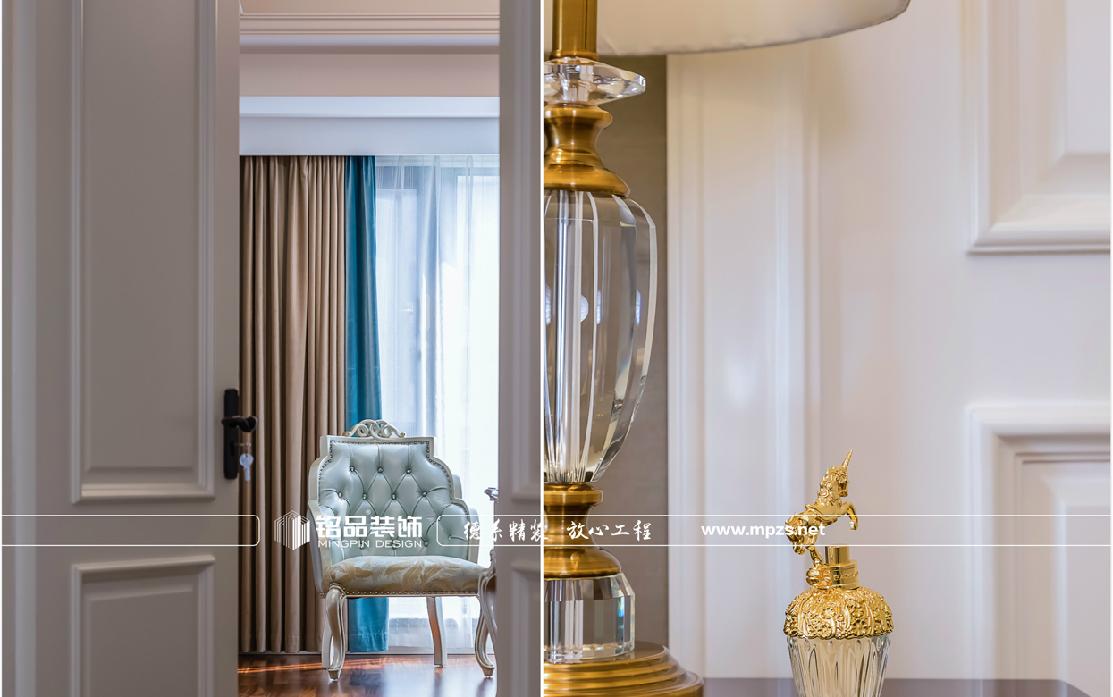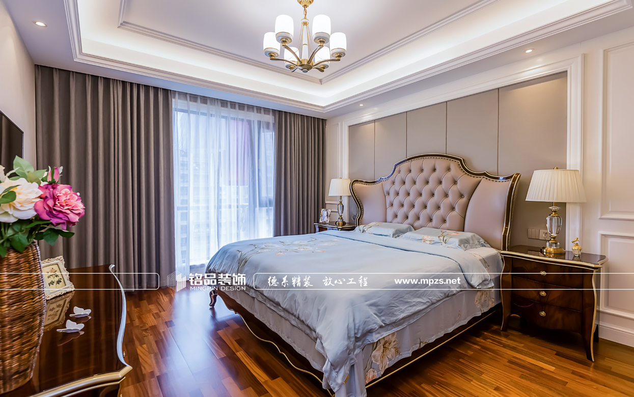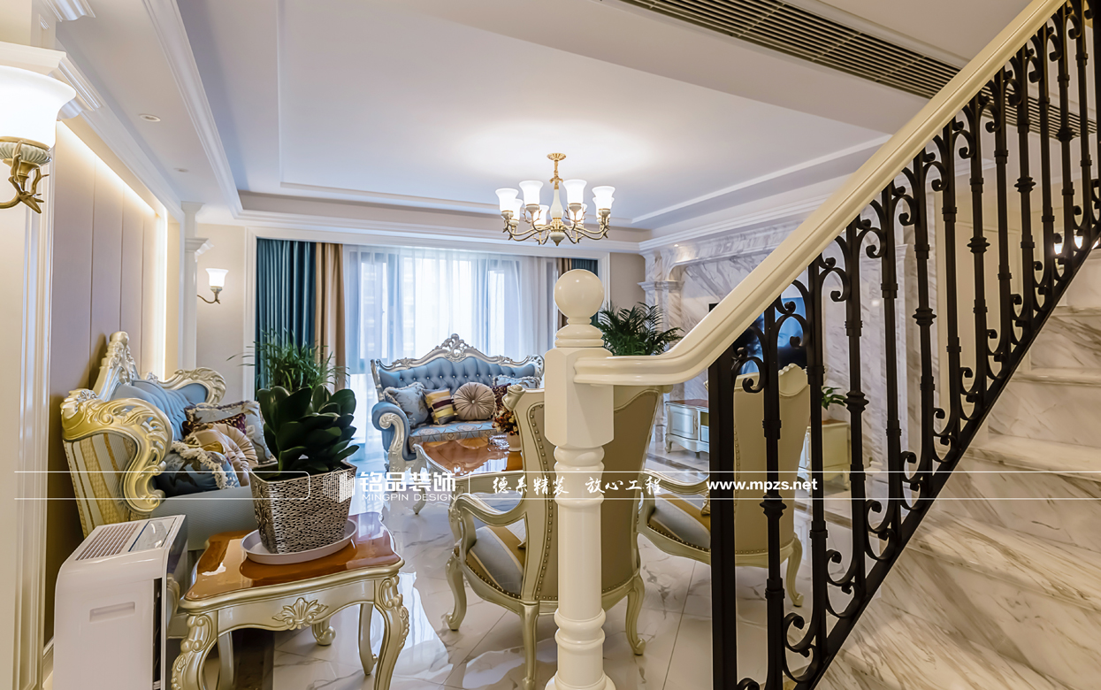 作品的最大的亮點是“形散而神聚” 墻壁大面積的白色和金色,配合暗藍色的沙發(fā),酒紅色的茶幾,整個色調(diào)看起來明亮大方,藍色和金色的窗簾遙相呼應(yīng),其中水晶宮燈和羅馬古柱都是點睛之筆,餐廳墻壁上的油畫,臥室的臺燈,讓人們有古典優(yōu)雅與從容的感覺,透過白色的沙曼,陽光傾灑在深色的木地板上, 與粉色的床品形成一幅和諧溫馨家的感覺
