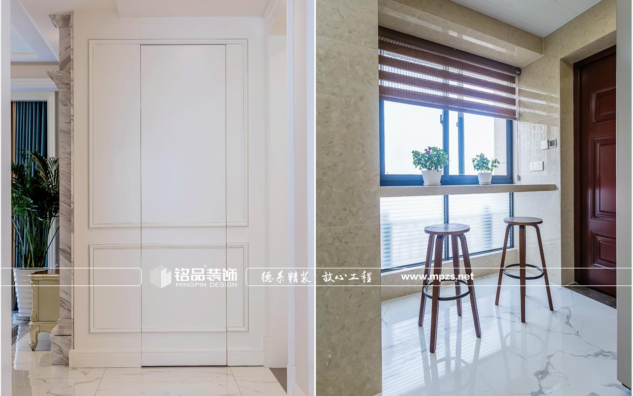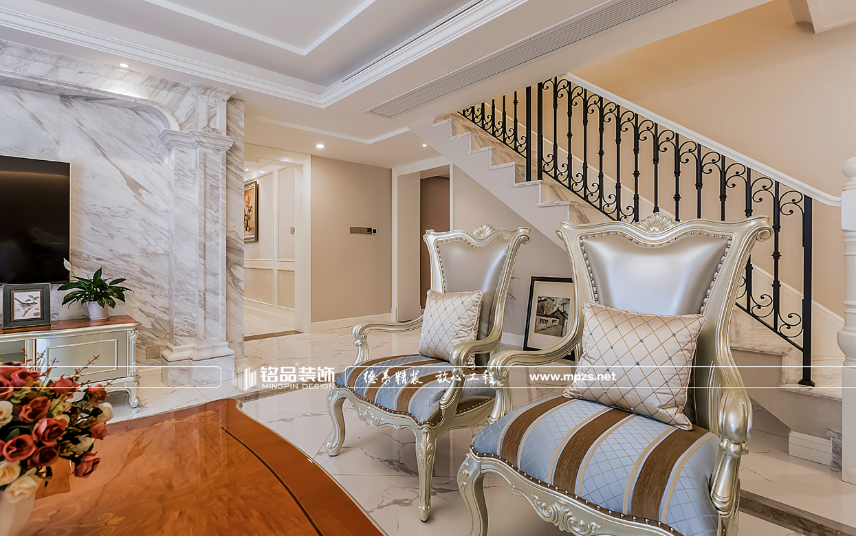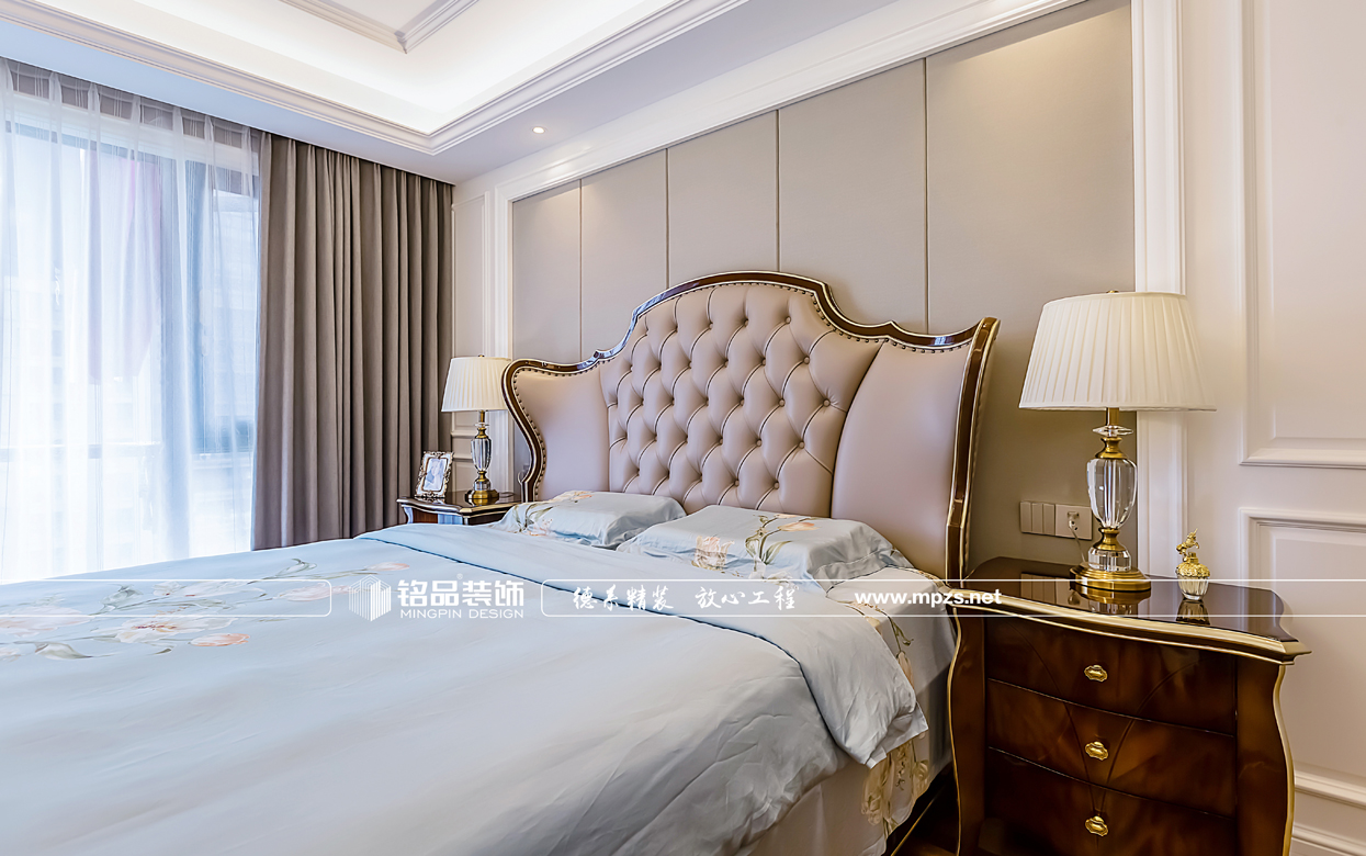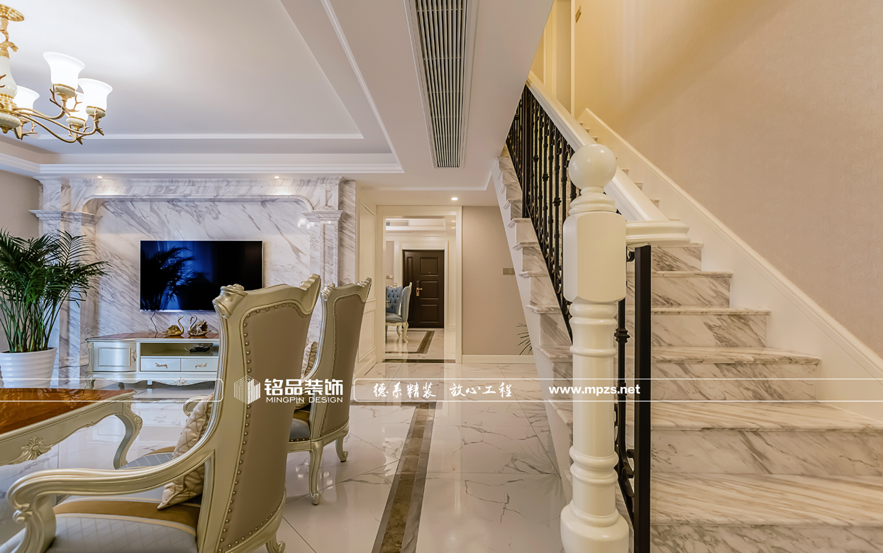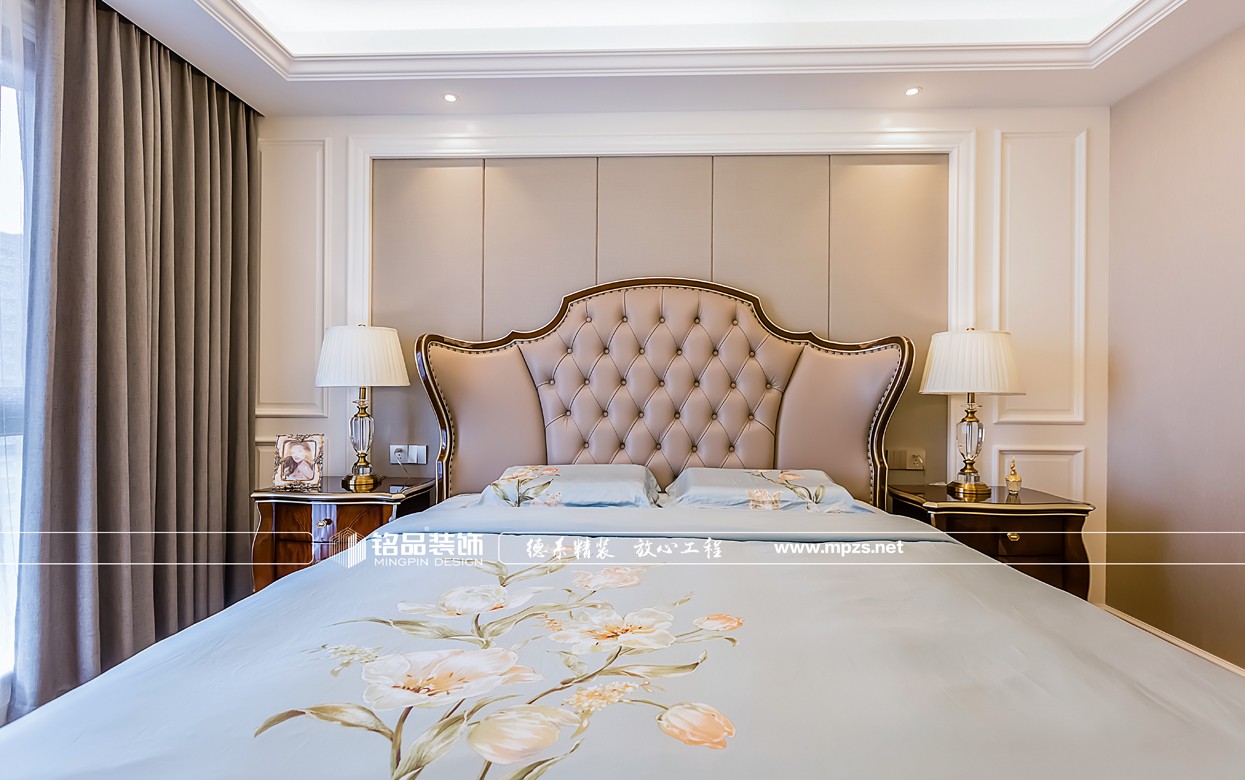 作品的最大的亮點是“形散而神聚” 墻壁大面積的白色和金色,配合暗藍色的沙發(fā),酒紅色的茶幾,整個色調(diào)看起來明亮大方,藍色和金色的窗簾遙相呼應(yīng),其中水晶宮燈和羅馬古柱都是點睛之筆,餐廳墻壁上的油畫,臥室的臺燈,讓人們有古典優(yōu)雅與從容的感覺,透過白色的沙曼,陽光傾灑在深色的木地板上, 與粉色的床品形成一幅和諧溫馨家的感覺