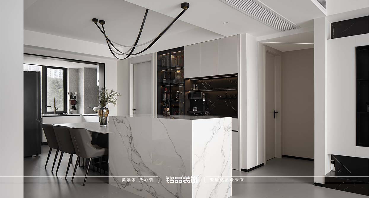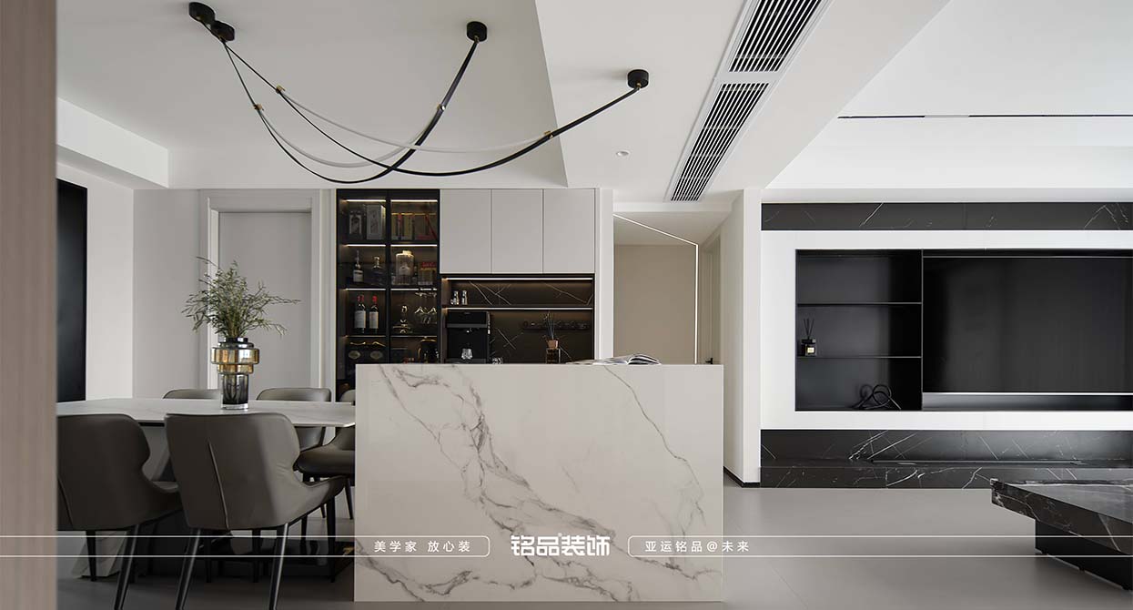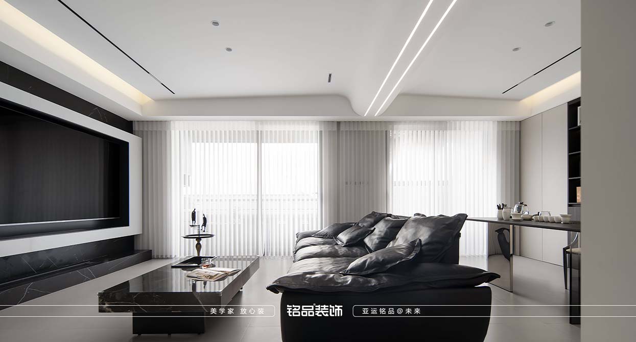 綠城桂語映月裝修因為客廳和房間打通后原本做的打通的懸浮吊頂,后期局改墻面拆除后吊頂位置有過梁,所以和業(yè)主再次溝通方案吊頂設(shè)計成折頁書對開的感覺,雖然客廳和茶室在同一個空間但是吊頂又仿佛將兩個空間分開了