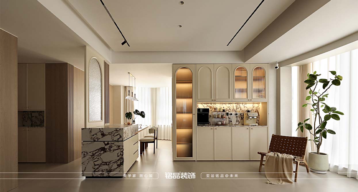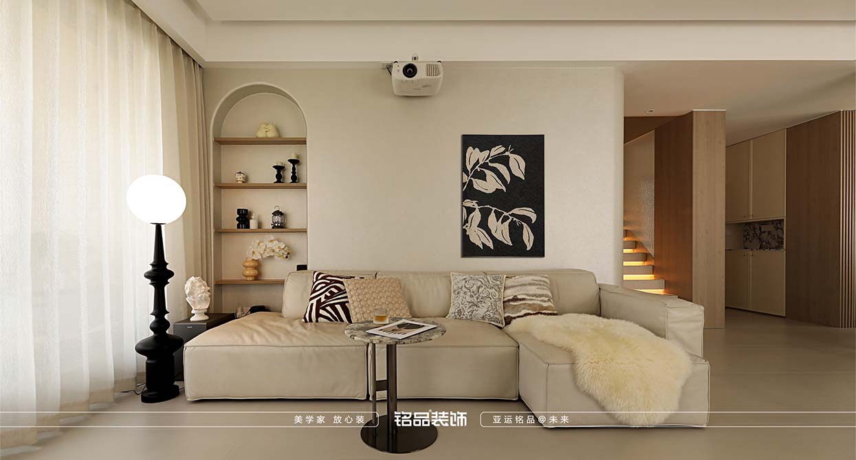 不同材質(zhì)的融合能讓冰冷的建筑體擁有溫度,木紋往往能給人溫暖柔軟的觸感,而水磨石質(zhì)感的樓梯踏步以及暖色調(diào)的藝術(shù)涂料,能讓置身于空間中的人放下一天的疲憊,享受完全屬于自己的時光。角落里一個簡單的圓弧形設(shè)計,也能自成一道景觀,整體空間以無主燈設(shè)計增強空間感與整潔感。。家是圍繞著人居生活而展開的,空間里每一鐘材質(zhì)結(jié)構(gòu)的呈現(xiàn),都承載著居住者的日常生活和個人喜好,剛和業(yè)主接觸的時候,就從他們身上感受到了溫暖和隨和,所以最后我們的呈現(xiàn)也是相同的氛圍感,也體現(xiàn)了主人的個性。