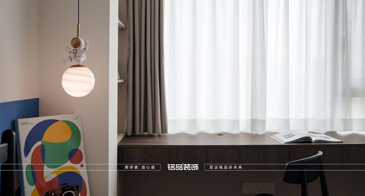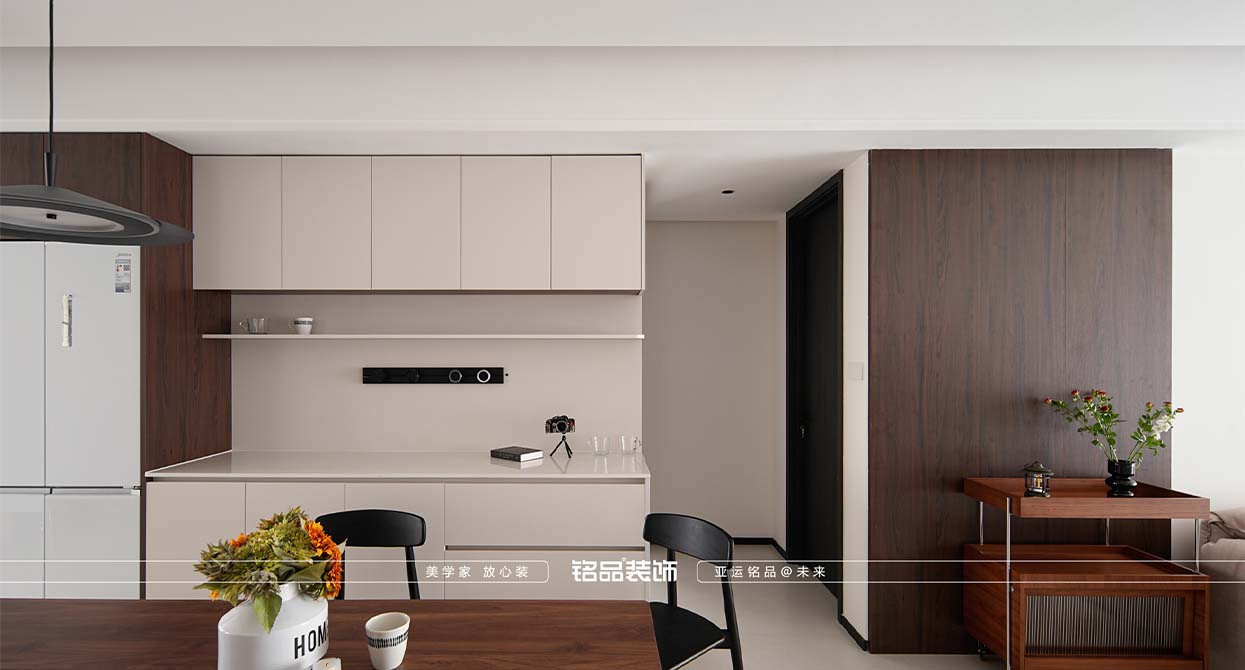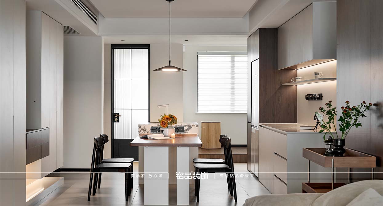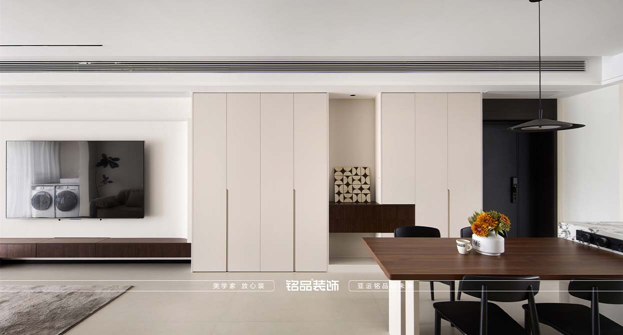 客餐廳+書房是整個開放式設(shè)計,南北通透,奶油色柔光地磚通鋪,視覺延伸,通透又顯大