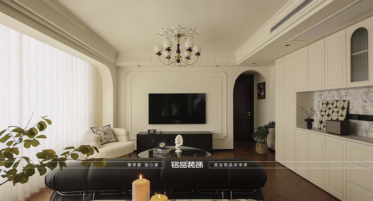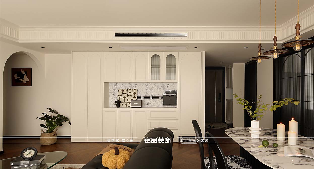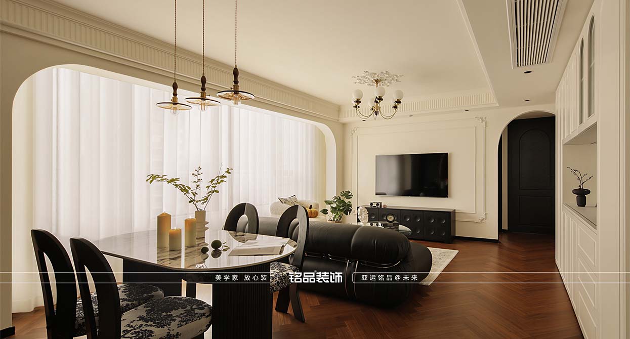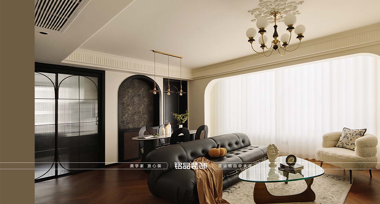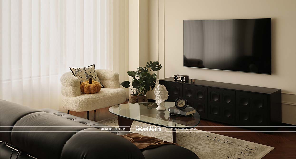 客廳地面采用了實(shí)木胡桃木,沙發(fā)采用黑色皮革,除此以外,還采用了藤編、麻布等自然質(zhì)感的材料,營造出復(fù)古懷舊的質(zhì)感。