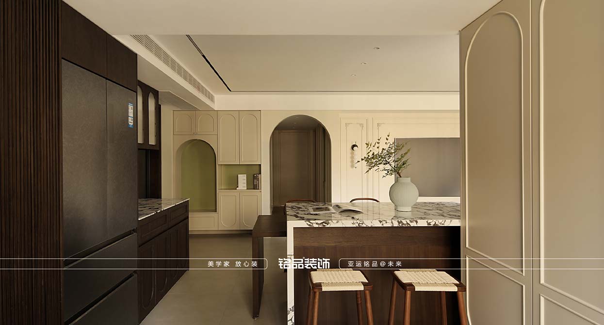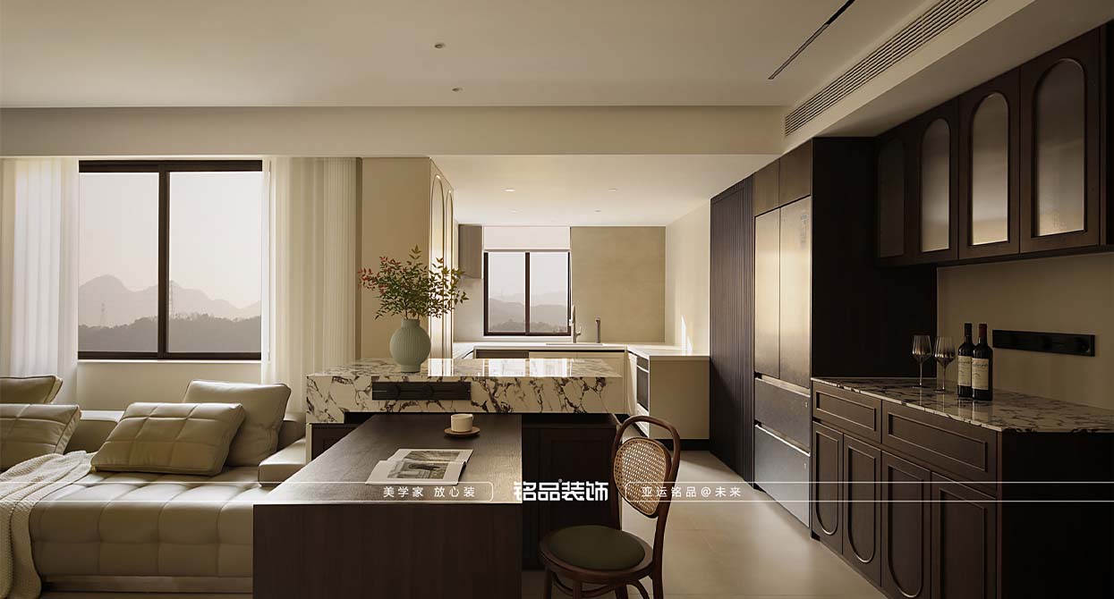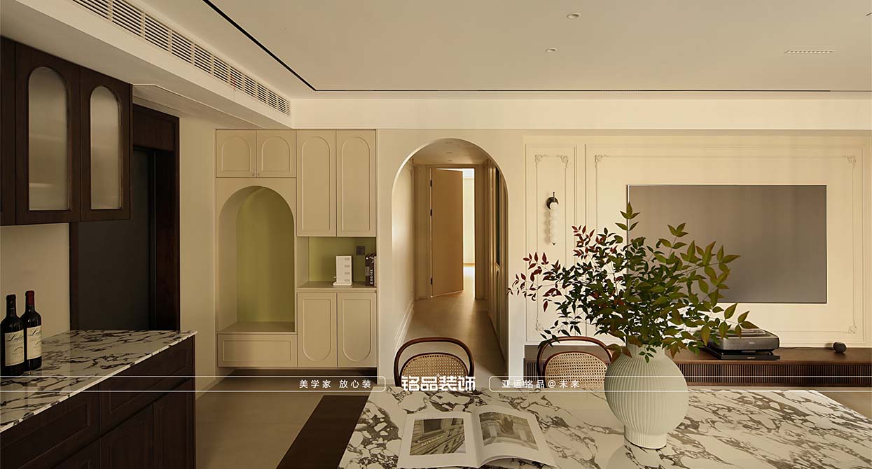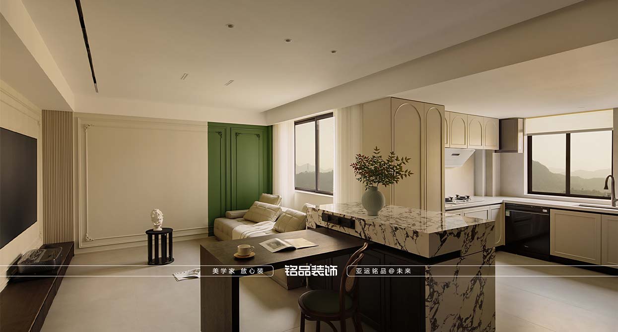 本案設(shè)計(jì)在經(jīng)過設(shè)計(jì)改造之后,進(jìn)入屋內(nèi),一種歸家的寧靜和安逸撲面而來,因客餐廳是朝北的布局,所以選擇開放式的廚房設(shè)計(jì),將空間的抽線貫通,開闊是的布局令空間通透而明亮。空間上以現(xiàn)代風(fēng)格+法式元素為設(shè)計(jì)手法,暖灰色調(diào)為主,注重加入一些胡桃木色和綠色,使空間結(jié)構(gòu)明確,整體呈現(xiàn)寧靜雅宅的舒適氛圍。