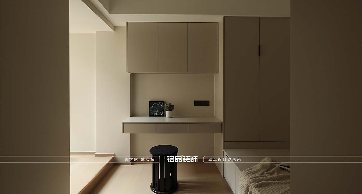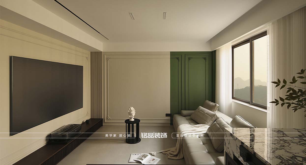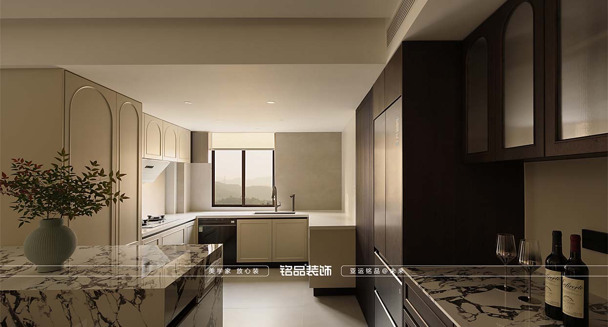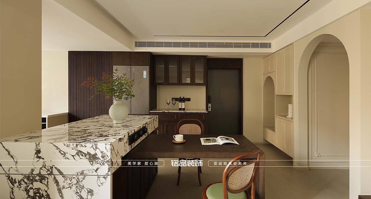 本案設(shè)計(jì)在經(jīng)過設(shè)計(jì)改造之后,進(jìn)入屋內(nèi),一種歸家的寧靜和安逸撲面而來,因客餐廳是朝北的布局,所以選擇開放式的廚房設(shè)計(jì),將空間的抽線貫通,開闊是的布局令空間通透而明亮。空間上以現(xiàn)代風(fēng)格+法式元素為設(shè)計(jì)手法,暖灰色調(diào)為主,注重加入一些胡桃木色和綠色,使空間結(jié)構(gòu)明確,整體呈現(xiàn)寧靜雅宅的舒適氛圍。