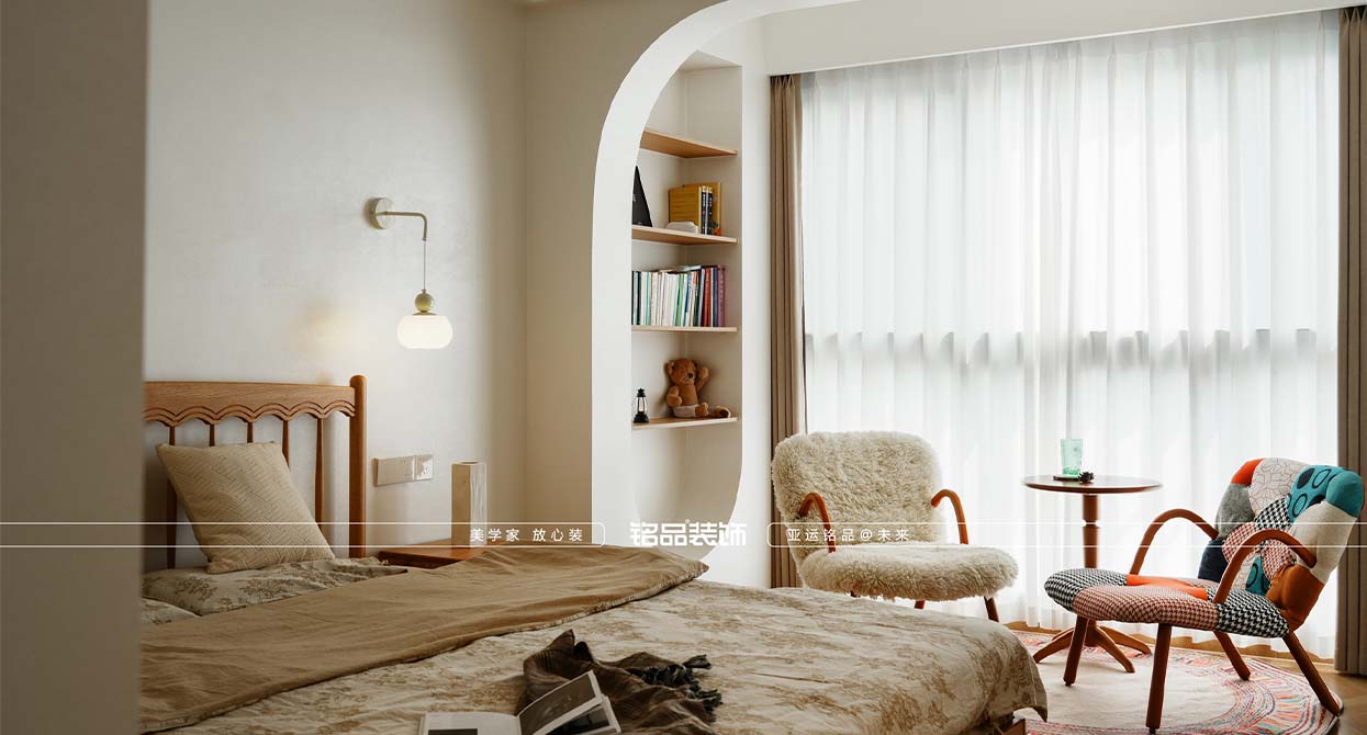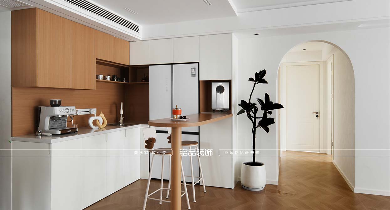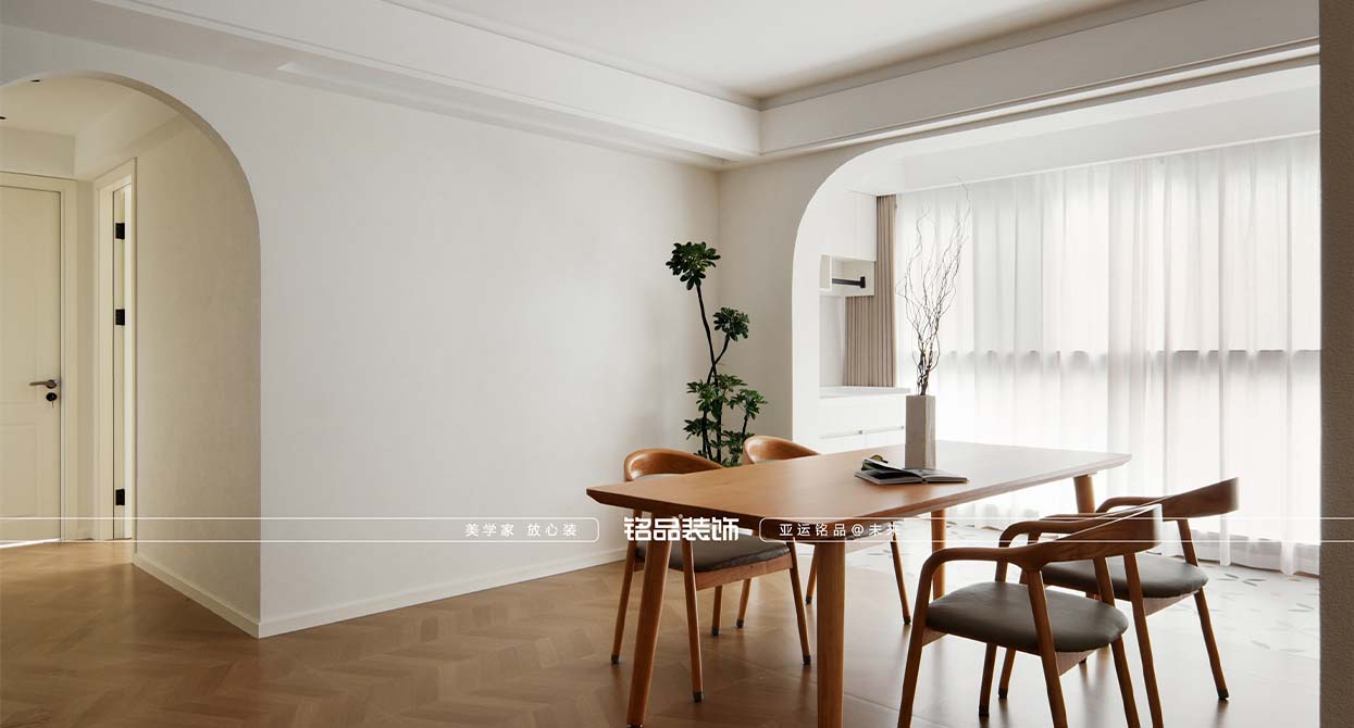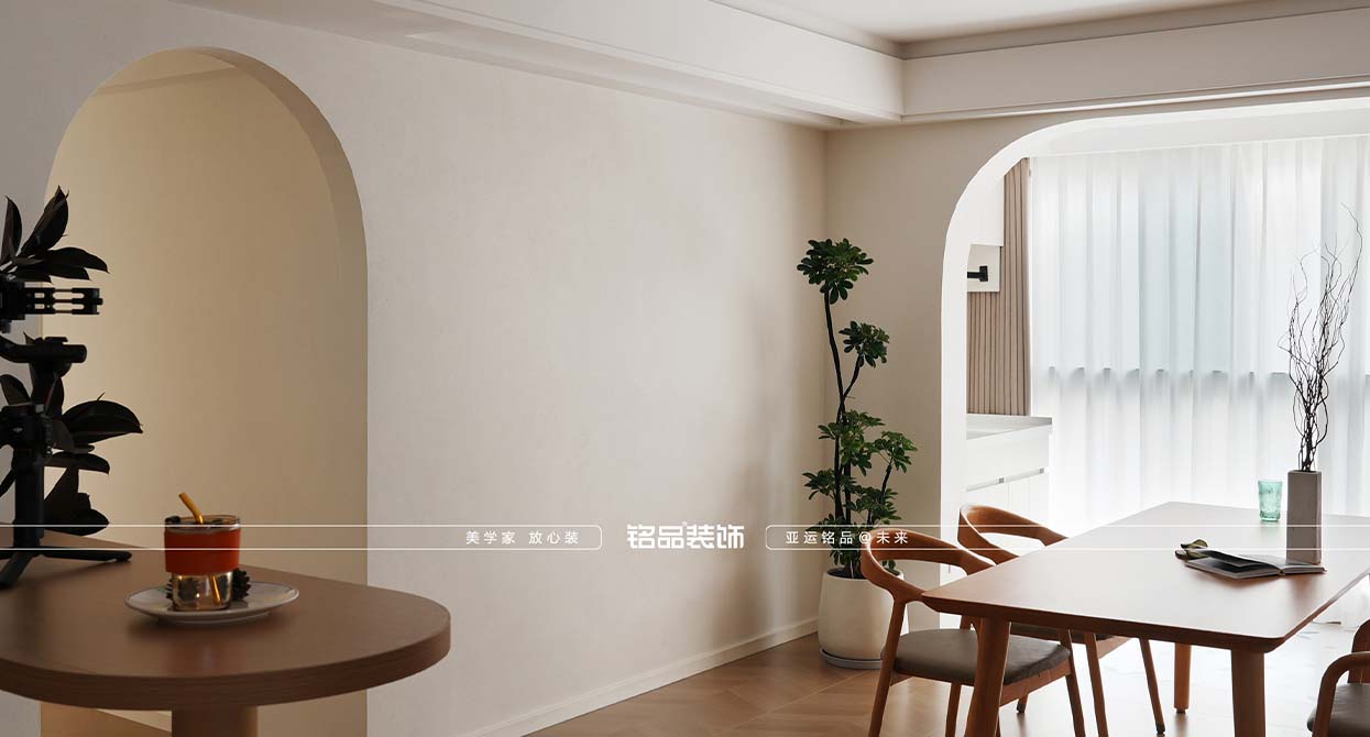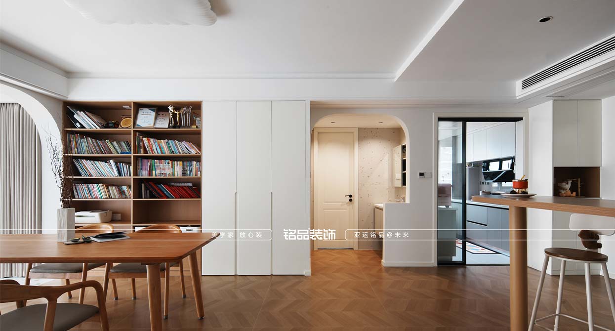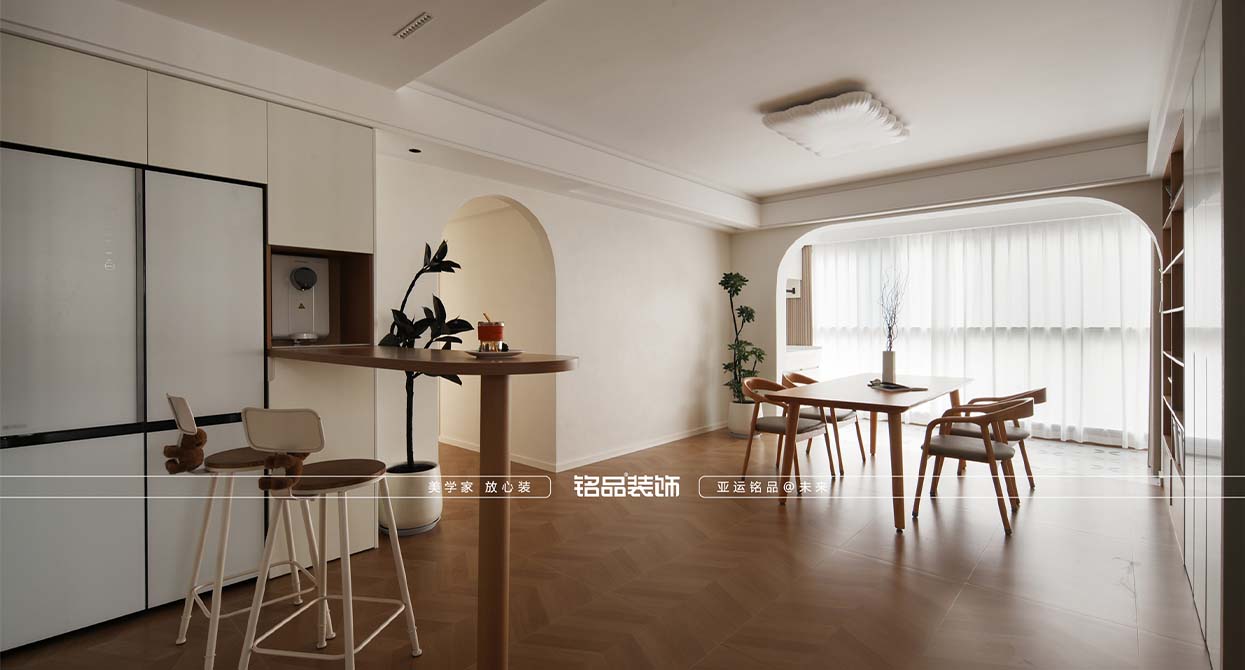 蕭山新安華庭以奶油原木風為基調(diào),采用去客廳化的設(shè)計,打破傳統(tǒng)客廳布局的全新設(shè)計理念,重新塑造空間的功能與價值。它摒棄了以電視、沙發(fā)、茶幾為核心的固定模式,轉(zhuǎn)換成以居住者的實際需求為核心,將客餐廳打造成家庭活動的核心區(qū)域,成為一個多功能、靈活且個性化的生活空間,增加了家庭成員之間的互動性,促進溝通與交流,同時兼具了美觀性與實用性,通過嵌入式柜體,不同組合的開放式與隱藏式收納,最大化利用空間,提升空間利用率。這種個性化的設(shè)計表達出了業(yè)主開朗隨和的性格,體現(xiàn)業(yè)主積極向上的人生態(tài)度和生活方式。
