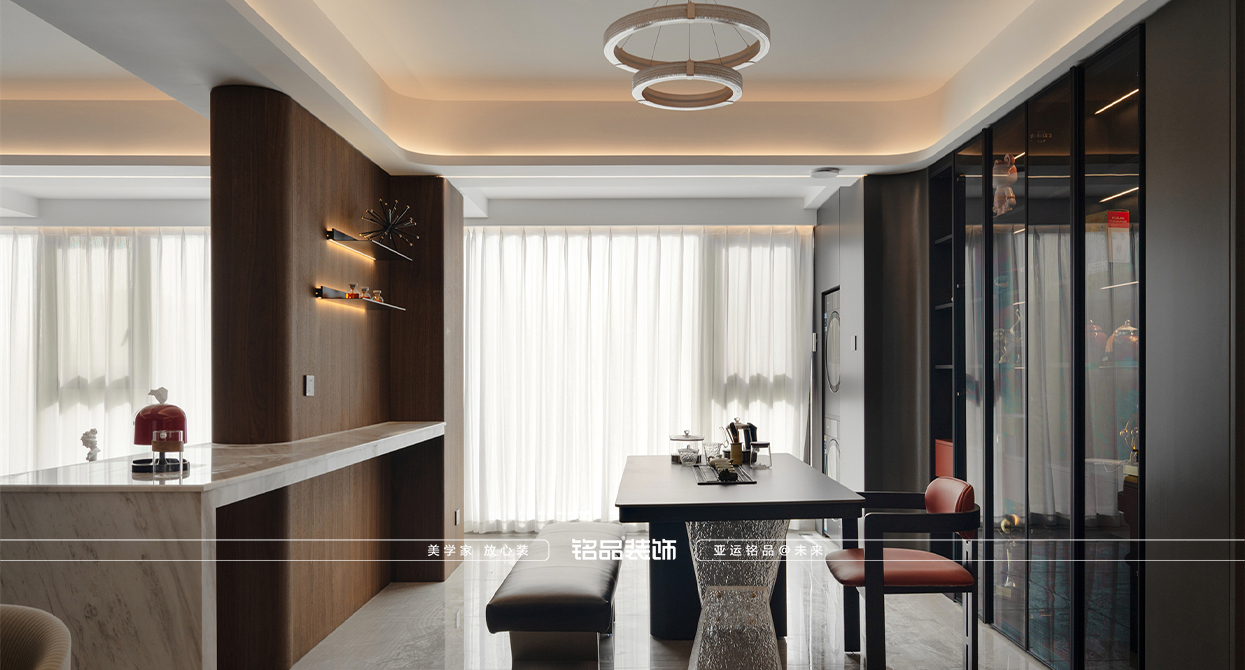 本案設計的是意式極簡風格,采用的是有主燈設計,運用了多處弧形的設計手法,巧妙的避開了之前結構的不足,增加了整體的視覺盛宴。