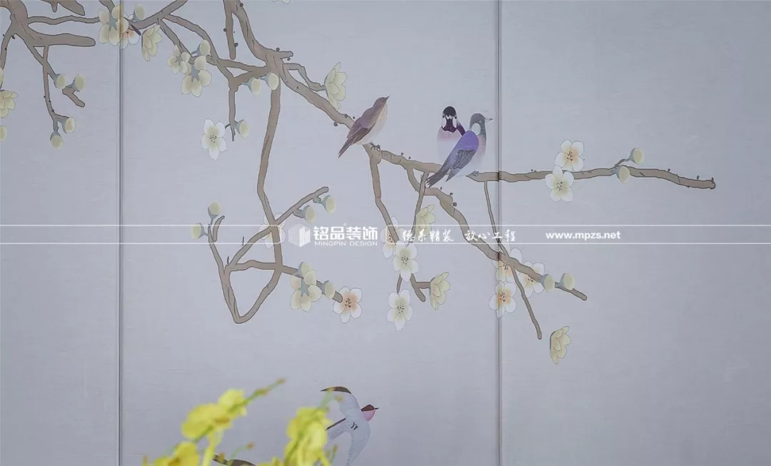 素凈的底色上搭配幾枝花,幾只鳥,整個空間就增加了活潑靈動的味道。