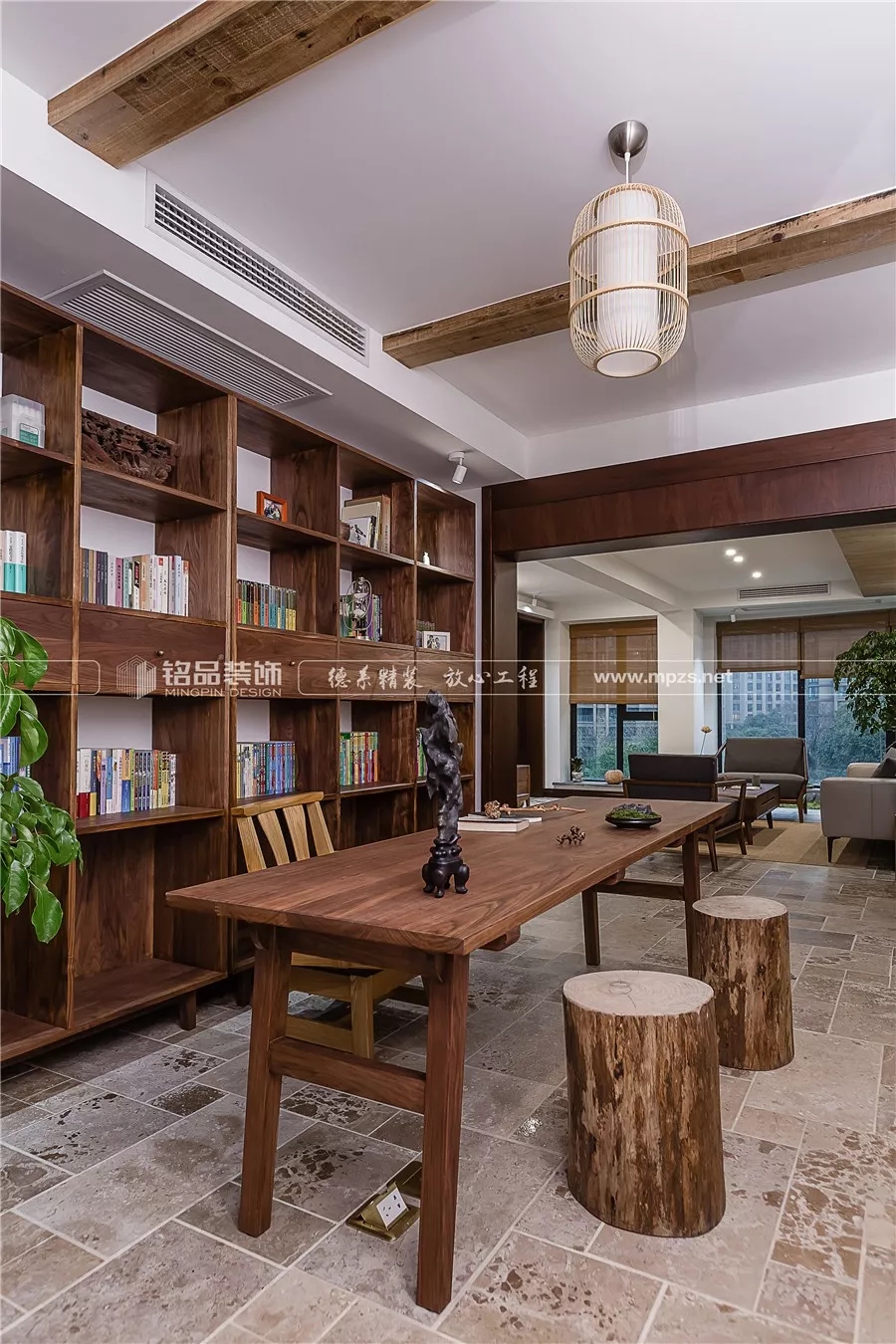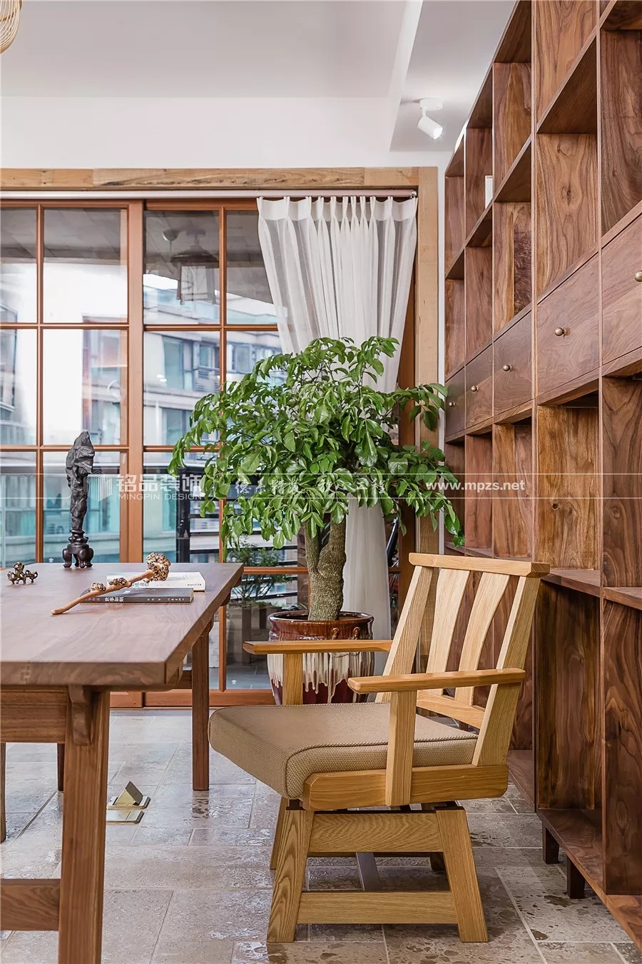 開放式書房由一個臥室改造而來,不拘一格,貫穿了客廳和陽臺,使得整個空間通透流暢,采光明亮。
