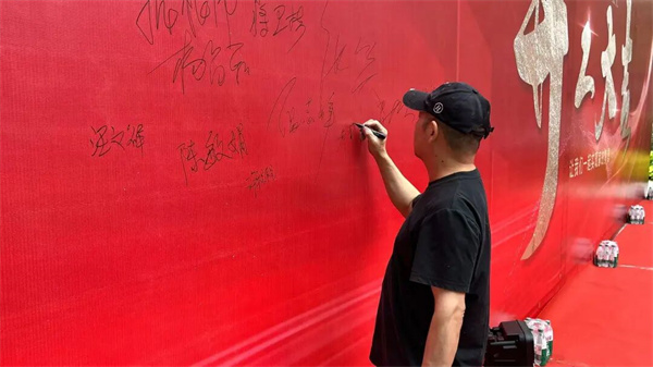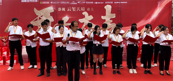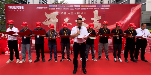 緊接著,品牌合作商、工程團(tuán)隊(duì)、設(shè)計(jì)師、銷售集體宣誓,他們整齊排列,神情莊重,右手握拳高舉,齊聲宣誓: