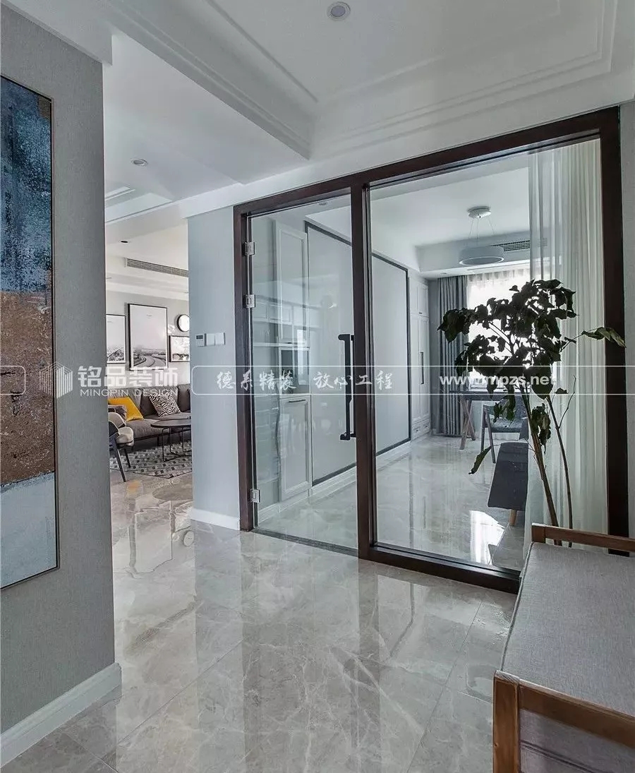 進(jìn)門處把房間的一面墻改造成全落地玻璃隔斷,室內(nèi)光線自由穿梭,整個空間豁然開朗。