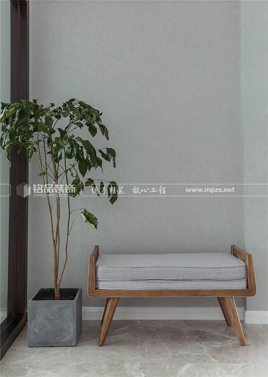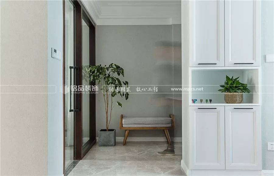 實(shí)木小矮凳方便業(yè)主換鞋,旁邊立著一株高高的綠植,錯落有致,心情也變得美好起來。