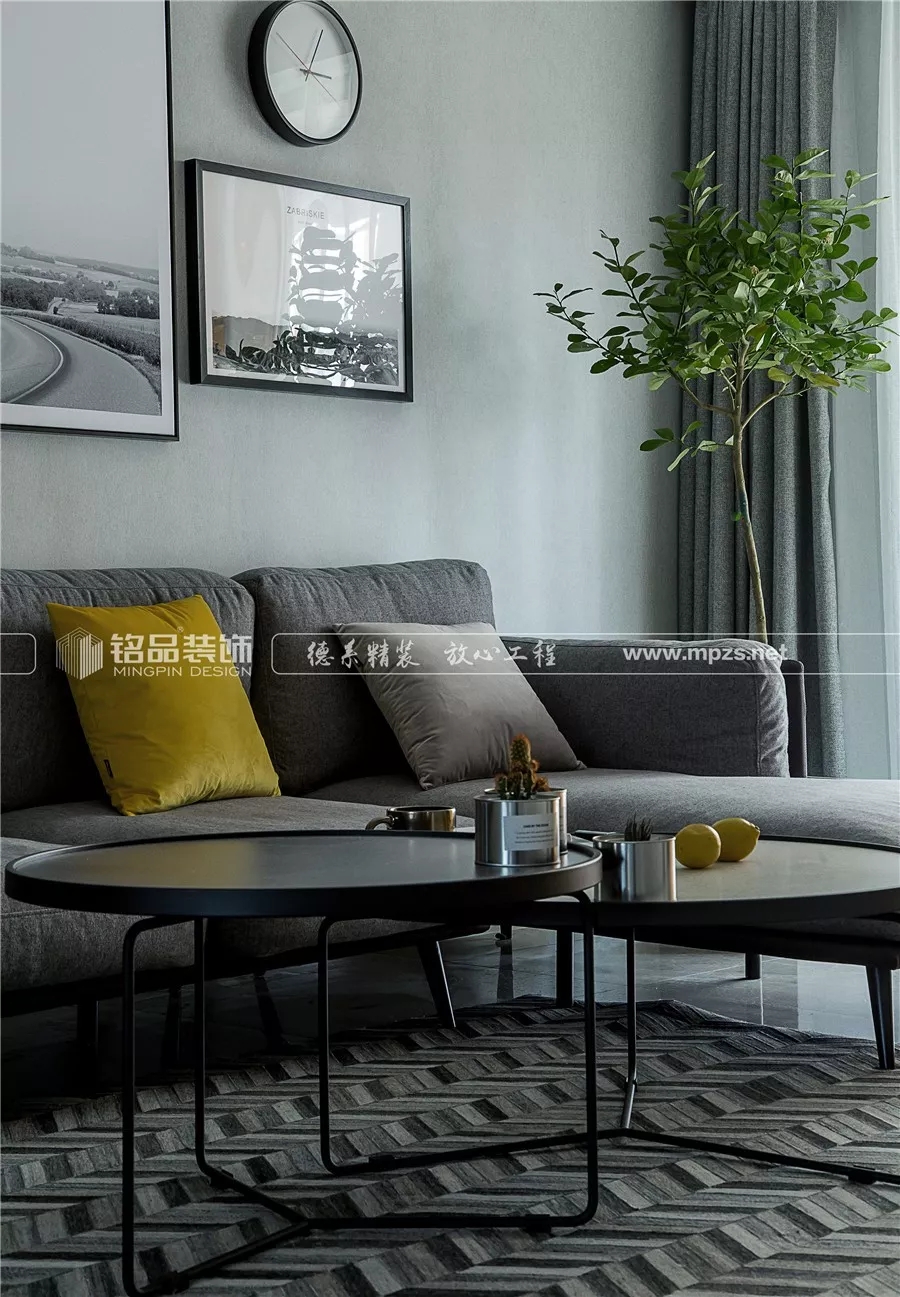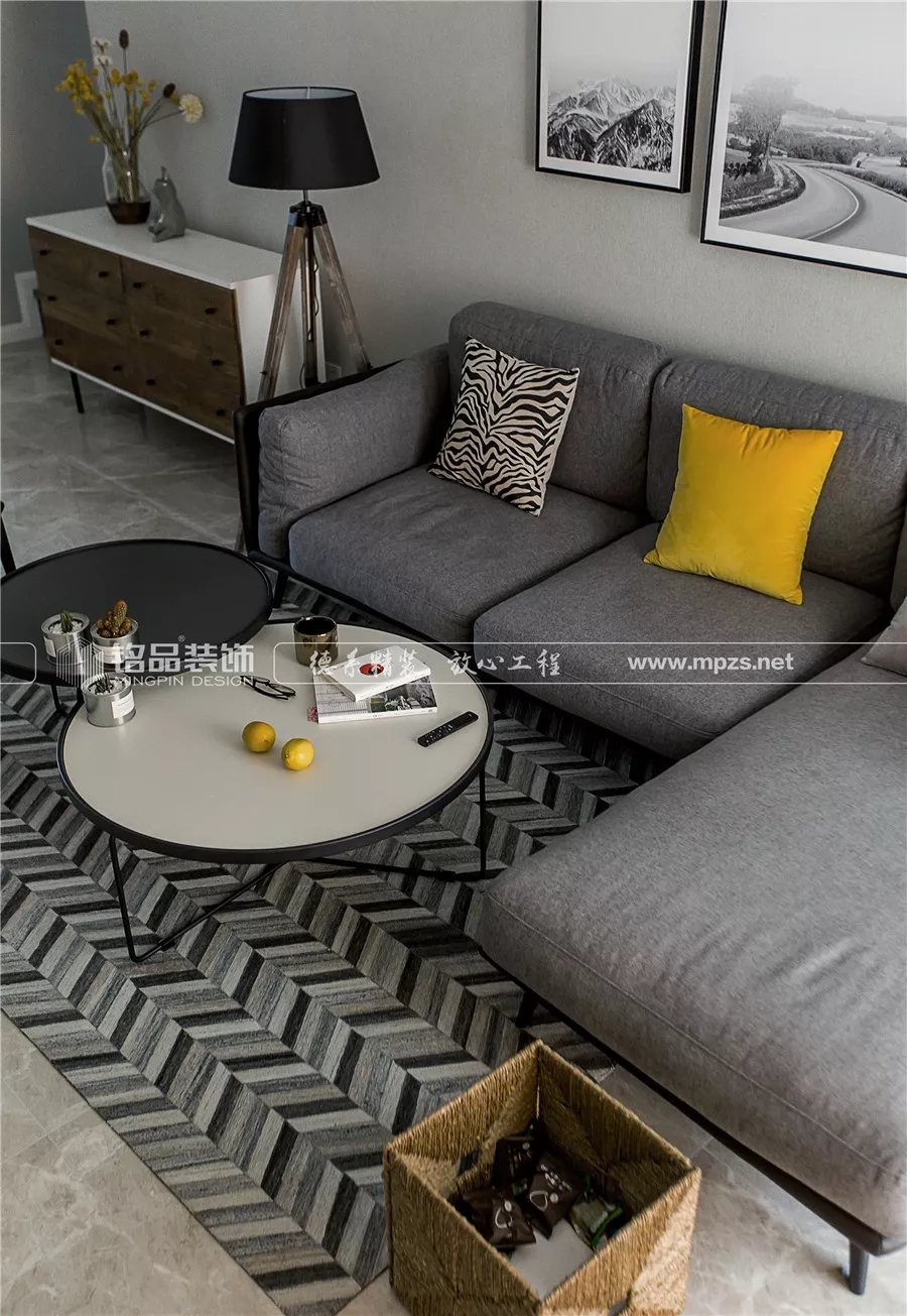 幾何圖案的短絨地毯清爽整潔,不易藏灰塵和雜物。黑白撞色的小茶幾簡單實(shí)用,占用的面積很小。