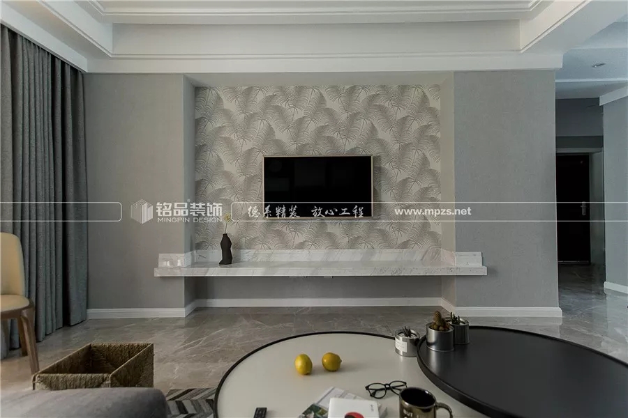 直線條造型的大理石臺面代替繁重的電視柜,給客廳預(yù)留了不少空間。