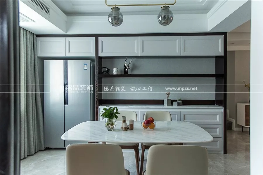 餐廳代表著食物和溫暖,自然需要用心打造。邊墻改造成整體的邊柜,不但干凈整潔,現(xiàn)代感十足,又提供了充足的收納。