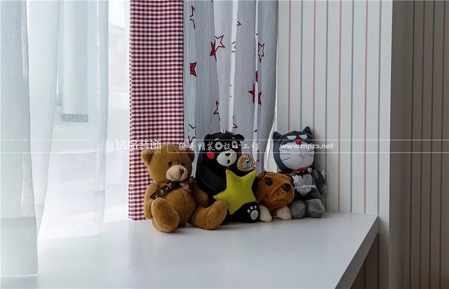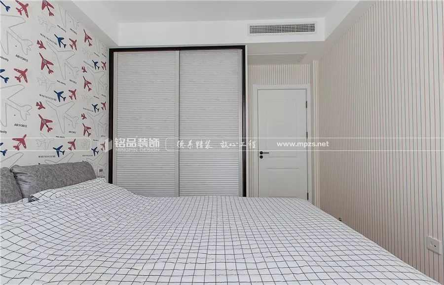 兒童房內(nèi),飛機(jī)圖案的壁紙充滿了童趣,飄窗改成了書桌,增加實(shí)用性。