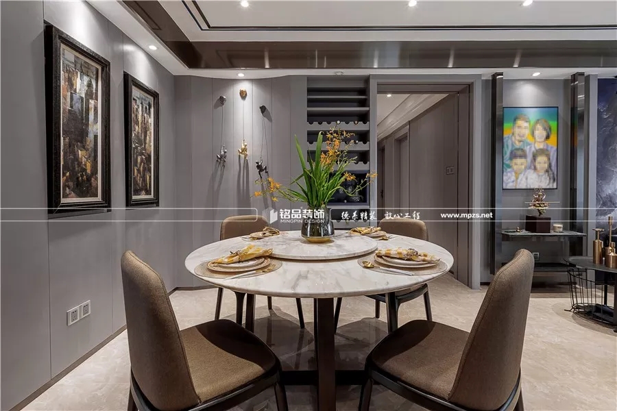餐廳延續(xù)了客廳的風(fēng)格,餐桌加以實(shí)用的酒柜點(diǎn)綴,不銹鋼與筒燈的互映組合使得整個(gè)空間交織著光影的律動(dòng)。