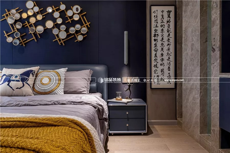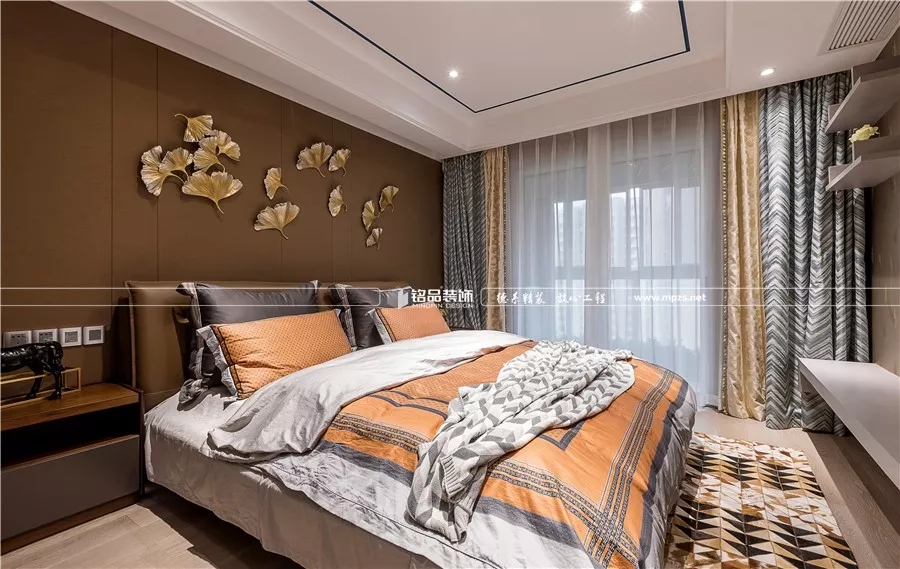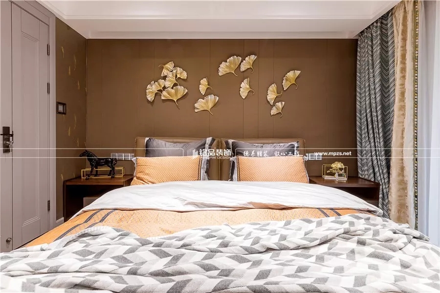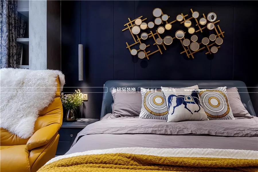 次臥擷取溫柔醇厚的摩卡棕為主調(diào),加上新配暗金元素的獨(dú)到運(yùn)用而新意倍出,不同于尋常的刻板印象,將藝術(shù)滲透進(jìn)生活,散發(fā)迷人的微醺美感。