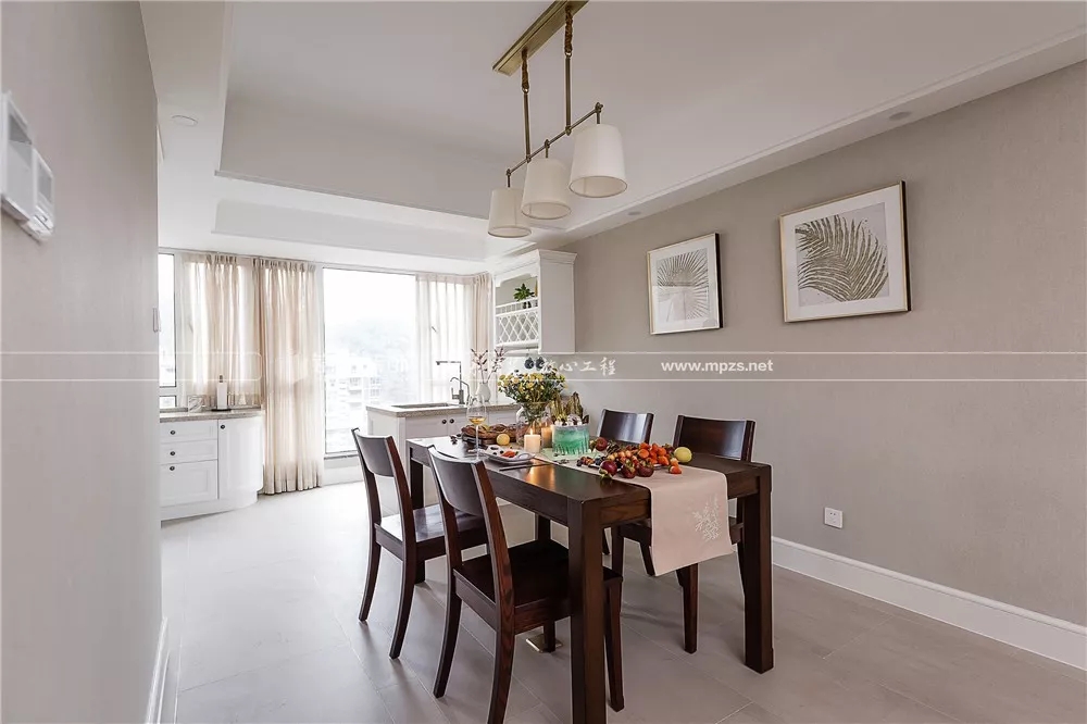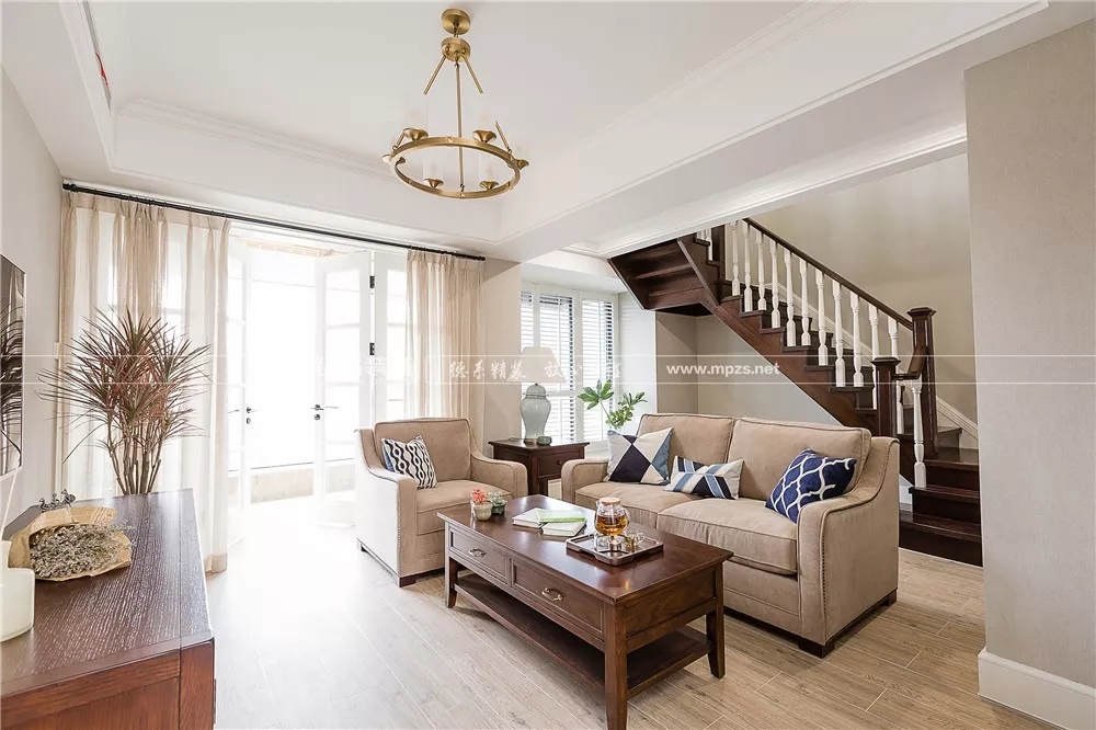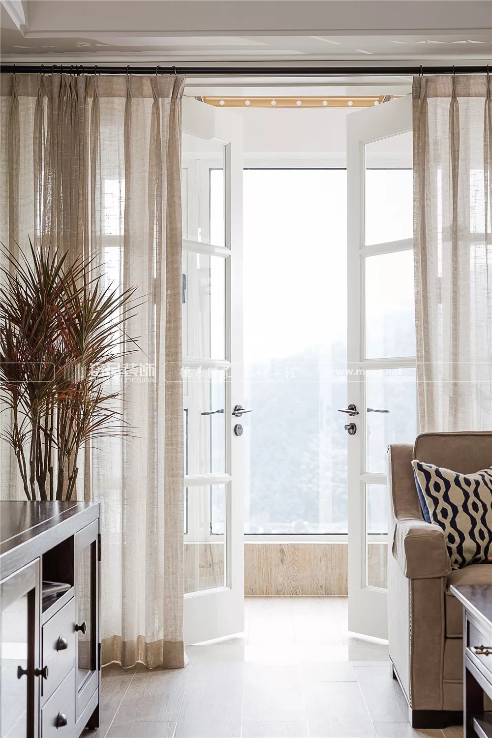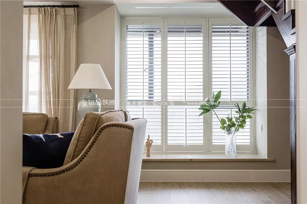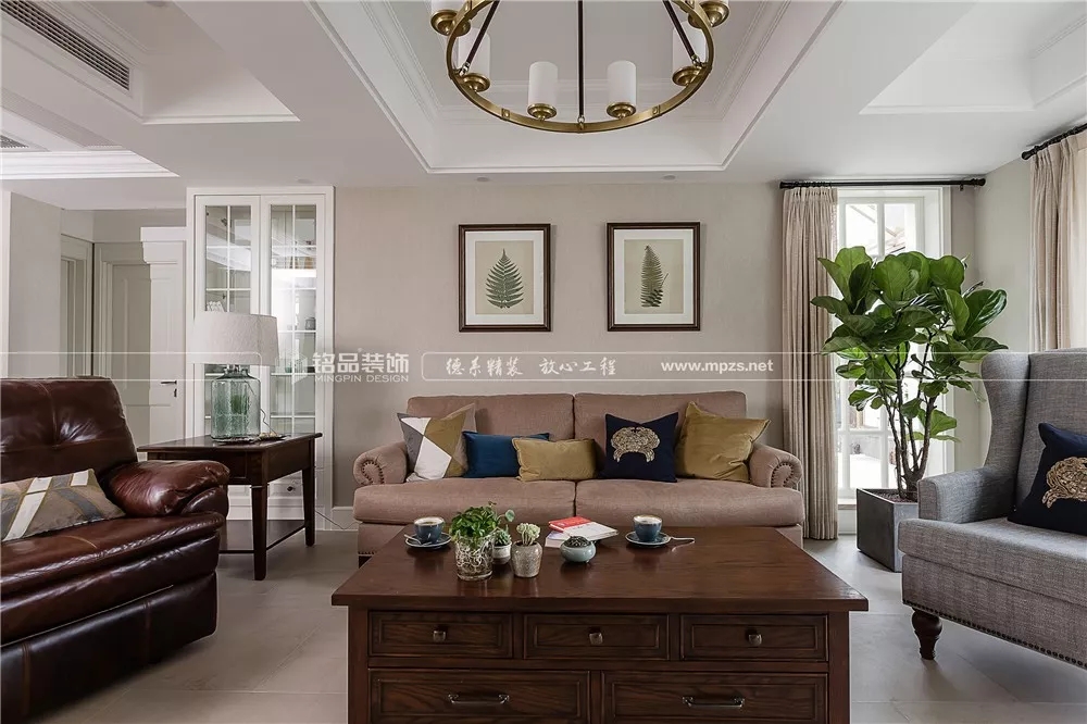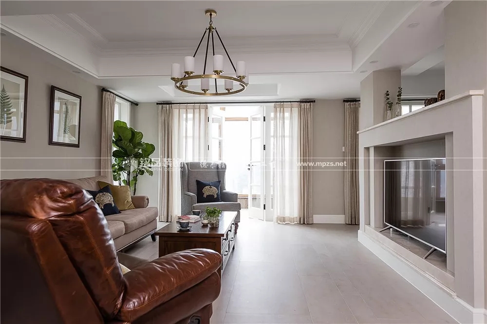 兩邊的落地窗讓室內(nèi)光線通透敞亮,直線造型的大理石背景墻透著濃郁的美式壁爐味道。