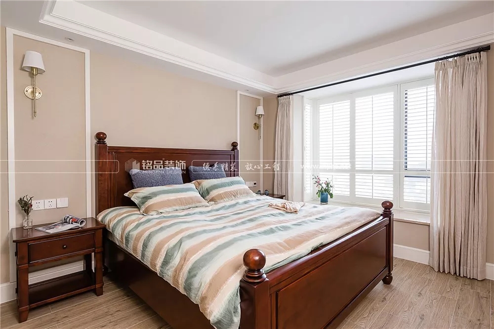 暖色的壁紙增加了臥室的溫馨氛圍,陽光透過淺色窗簾在地板上投下斑駁的光影,讓人不由感嘆歲月靜好。