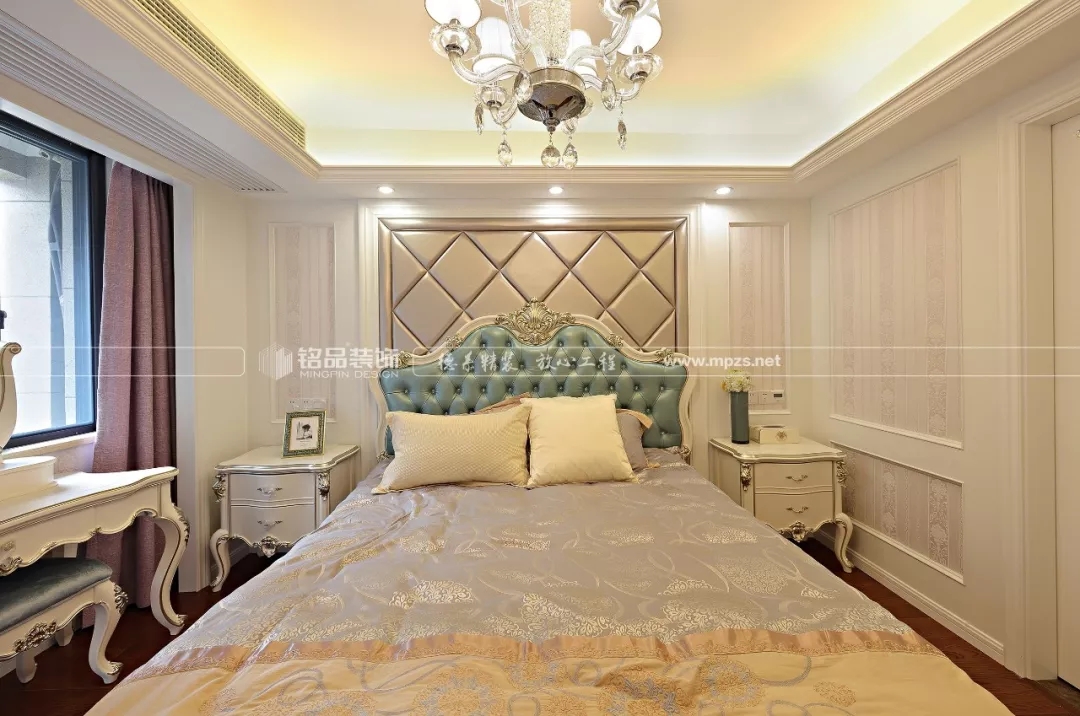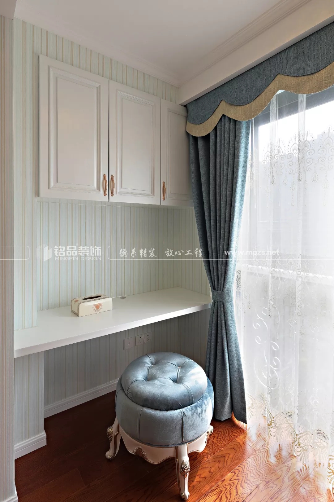 臥室陳設(shè)延續(xù)了一樓的舒適華美,整體家居風(fēng)格統(tǒng)一協(xié)調(diào),自然木色地板與淺藍(lán)窗簾生成寧?kù)o平和的氛圍,讓疲憊一天身心得到釋放,帶來(lái)精致好睡眠。