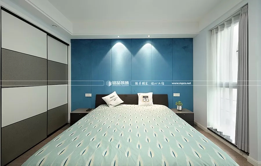 落地窗被太陽親吻了一天,還透著點(diǎn)點(diǎn)暖意,藍(lán)色的背景墻蘊(yùn)藏著大海的力量,治愈又安心。