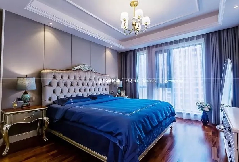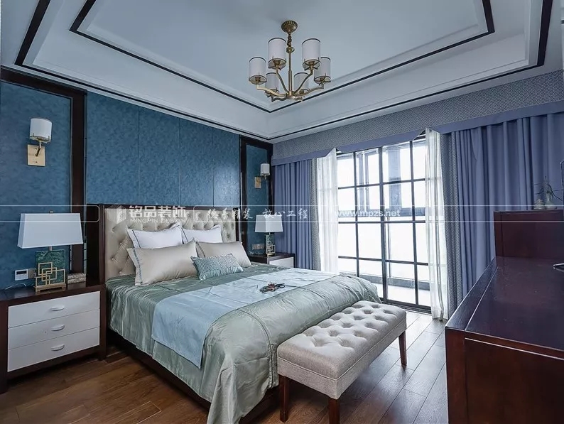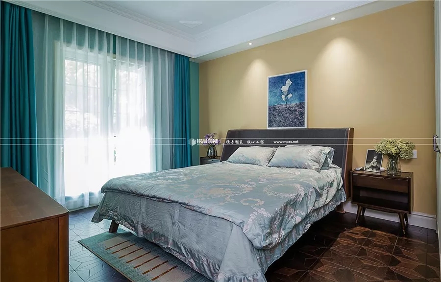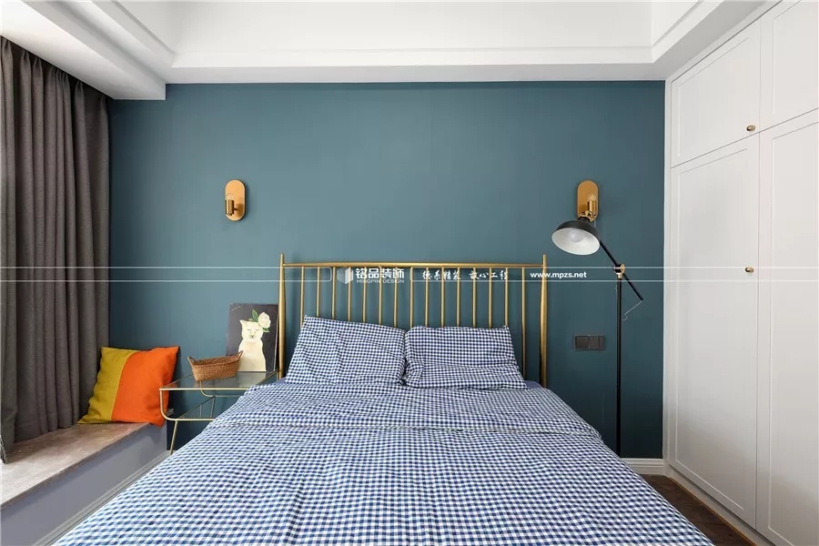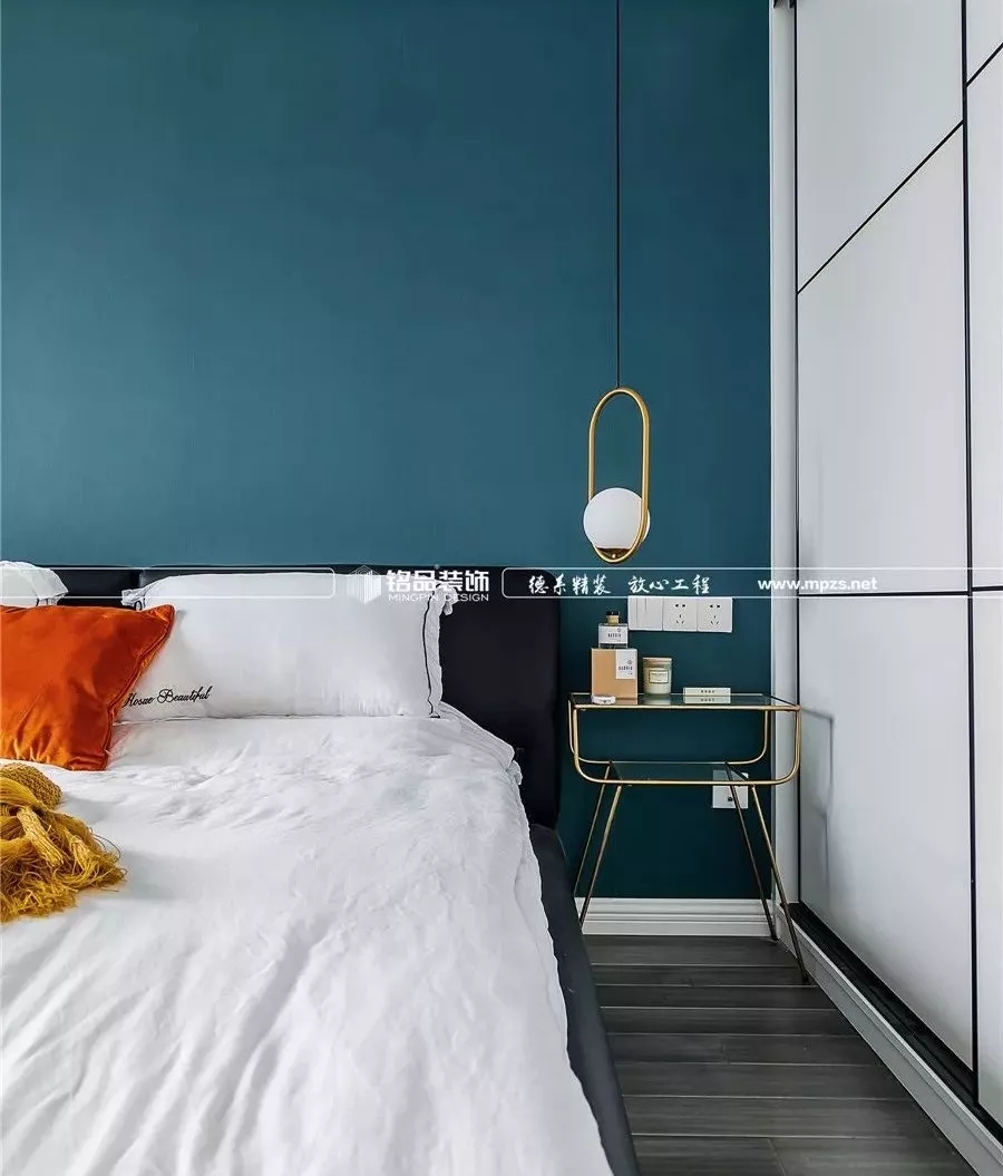 孔雀藍(lán)自帶獨(dú)特的氣質(zhì),優(yōu)雅不清冷,沉穩(wěn)而中正,搭配明朗輕盈的白色,讓臥室顯得寧靜雅致。