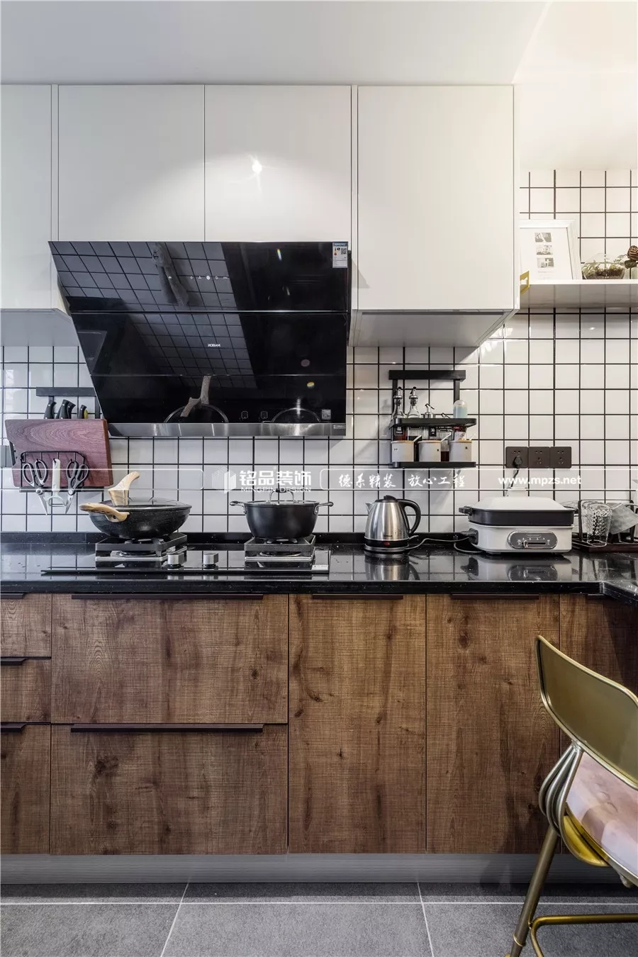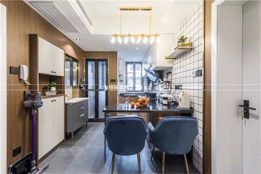 黑色臺面質(zhì)感十足,灰色地磚搭配柚木色的櫥柜相得益彰。亞光銅色的不銹鋼門套收口,讓過道區(qū)域更加寬敞。