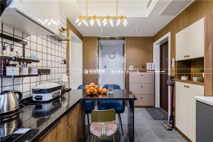 空間上:本著空間最大化的設(shè)計理念,設(shè)計師把公共區(qū)域與廚房區(qū)域聯(lián)通,加強了整體空間的延展性。
