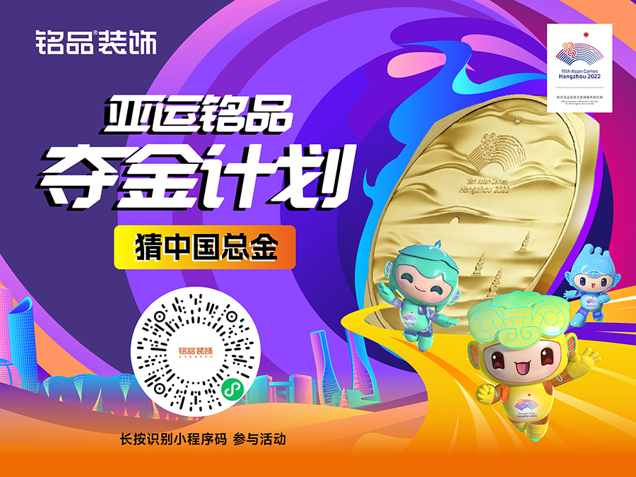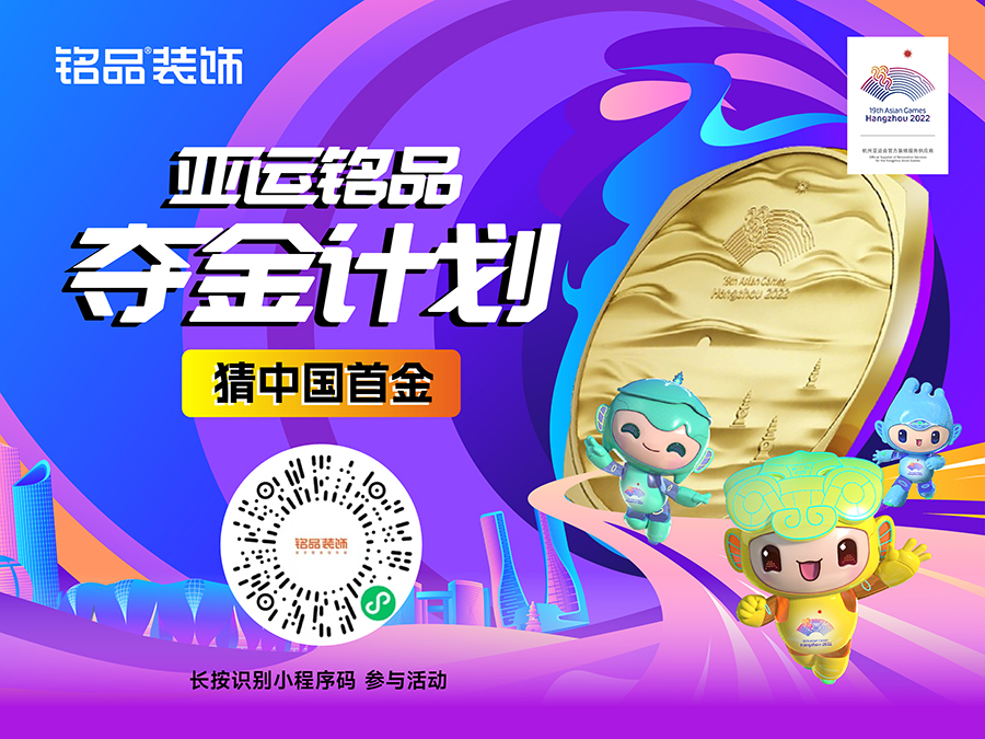 為助力亞運(yùn)賽事完美舉辦,第19屆亞運(yùn)會(huì)官方裝修服務(wù)供應(yīng)商銘品裝飾,推出“亞運(yùn)奪金計(jì)劃”,猜亞運(yùn)金牌,贏免費(fèi)裝修大獎(jiǎng)!驚喜連連,繽紛大獎(jiǎng)送不停!奪冠,亞運(yùn)年!