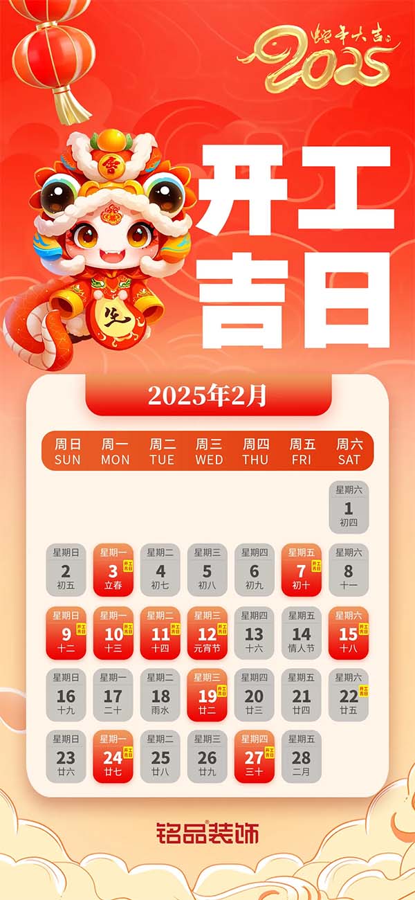 2月正處于冬季和春季的交替點(diǎn),盡管春意漸濃,但2月的溫度依然較低,且空氣濕度居高不下。因此,2月不適合進(jìn)行室內(nèi)刷漆、鋪設(shè)瓷磚等工程。如果必須施工,工作環(huán)境要保持干燥,并采取適當(dāng)?shù)姆莱贝胧?,防止木質(zhì)材料因受潮而損壞,確保施工順利進(jìn)行。另外,二月初十春節(jié)假期,一般是在元宵節(jié)之后可開工,大家要注意施工時間哦!