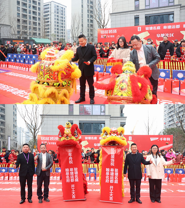金獅齊舞,開工大吉!杭州大區(qū)總經(jīng)理呂斌先生、杭州電視臺(tái)特約驗(yàn)房專家兼銘品皋塘社區(qū)首席質(zhì)量品鑒官大梁師傅一起執(zhí)金筆為舞獅點(diǎn)睛。帶著吉祥與祝福踏步而來的雄獅將現(xiàn)場(chǎng)氣氛推至高潮,象征著業(yè)主們生活美滿、事業(yè)有成。