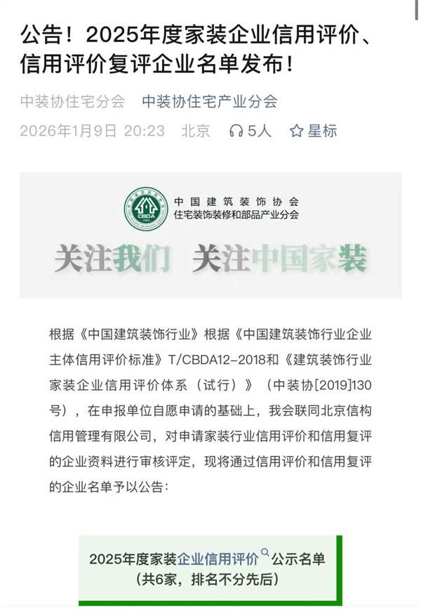 中國(guó)建筑裝飾協(xié)會(huì)住宅產(chǎn)業(yè)分會(huì)正式揭曉2025年度家裝企業(yè)信用評(píng)價(jià)結(jié)果,