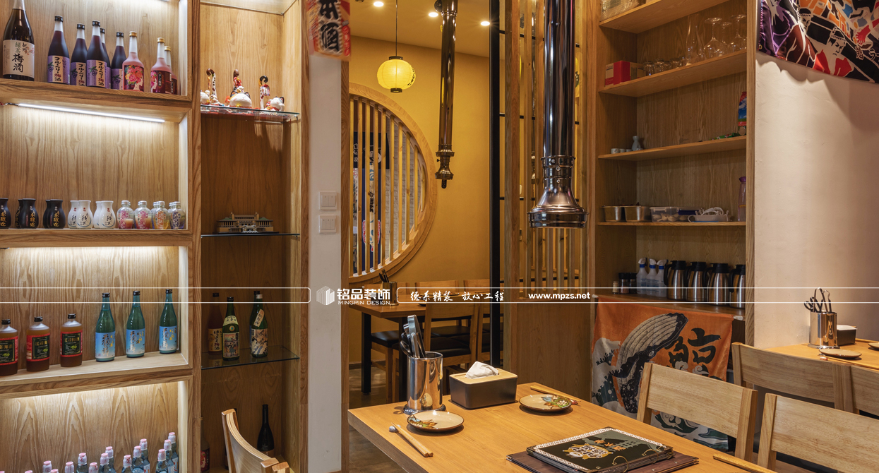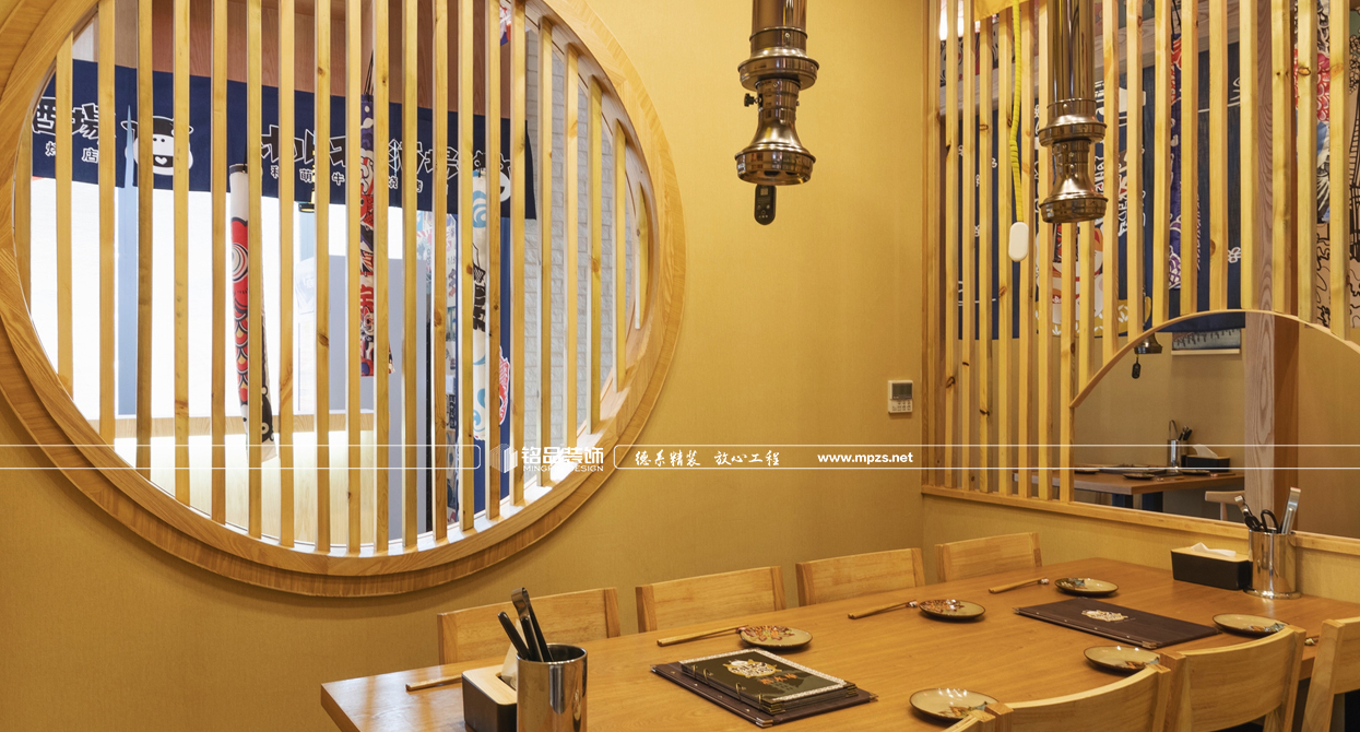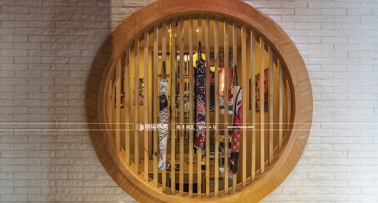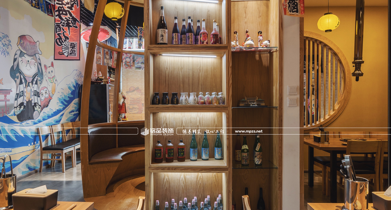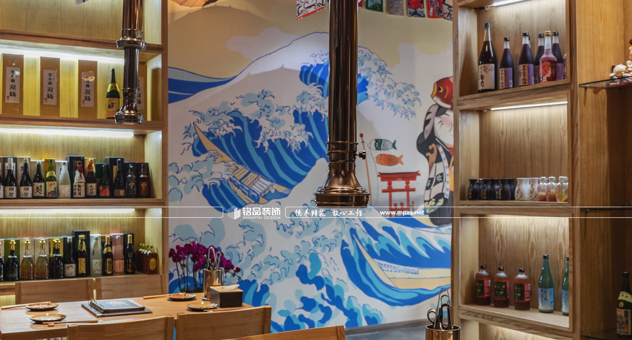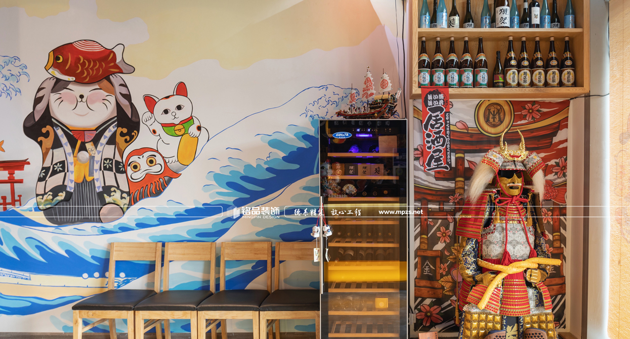 這套裝修案例位于杭州云臺國際中心,是一件日式料理燒烤店,設計師通過枯山水、日本武士等大量日式元素的運用來提升整個用餐環(huán)境的氛圍,一二樓使用升降梯便捷高效的送餐,墻面日本元素的墻繪