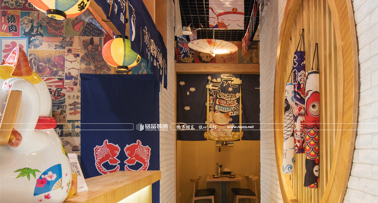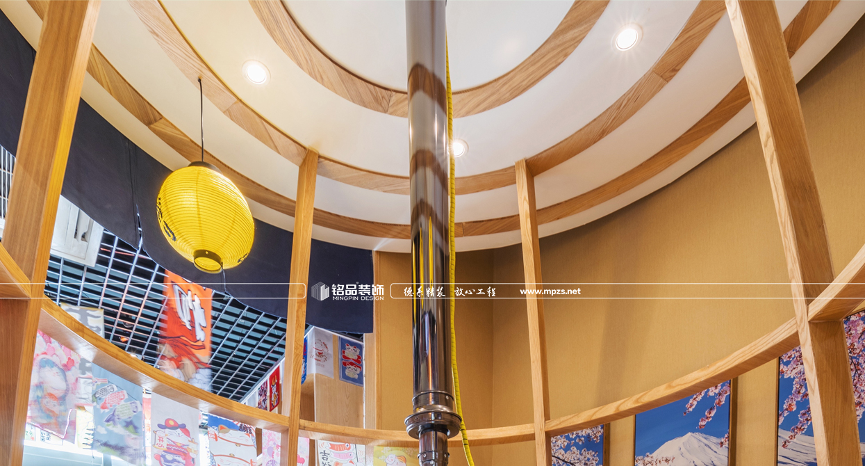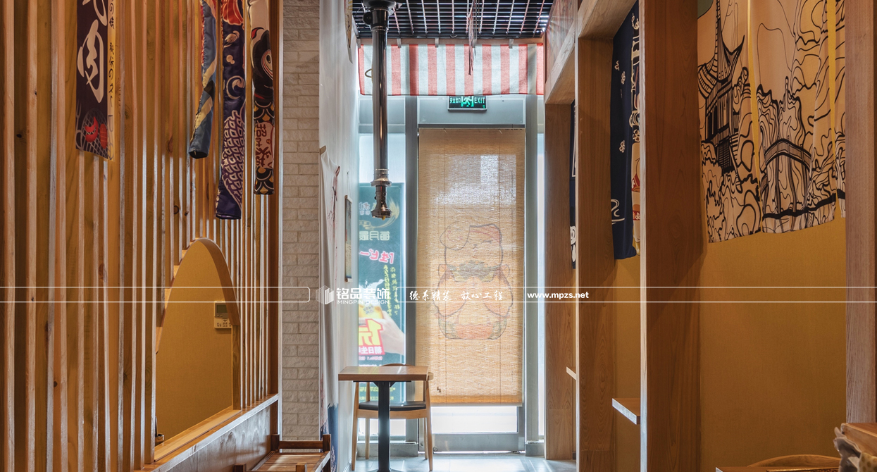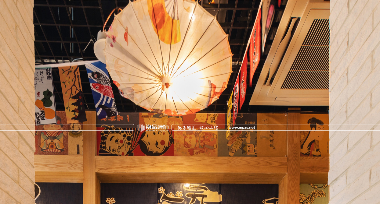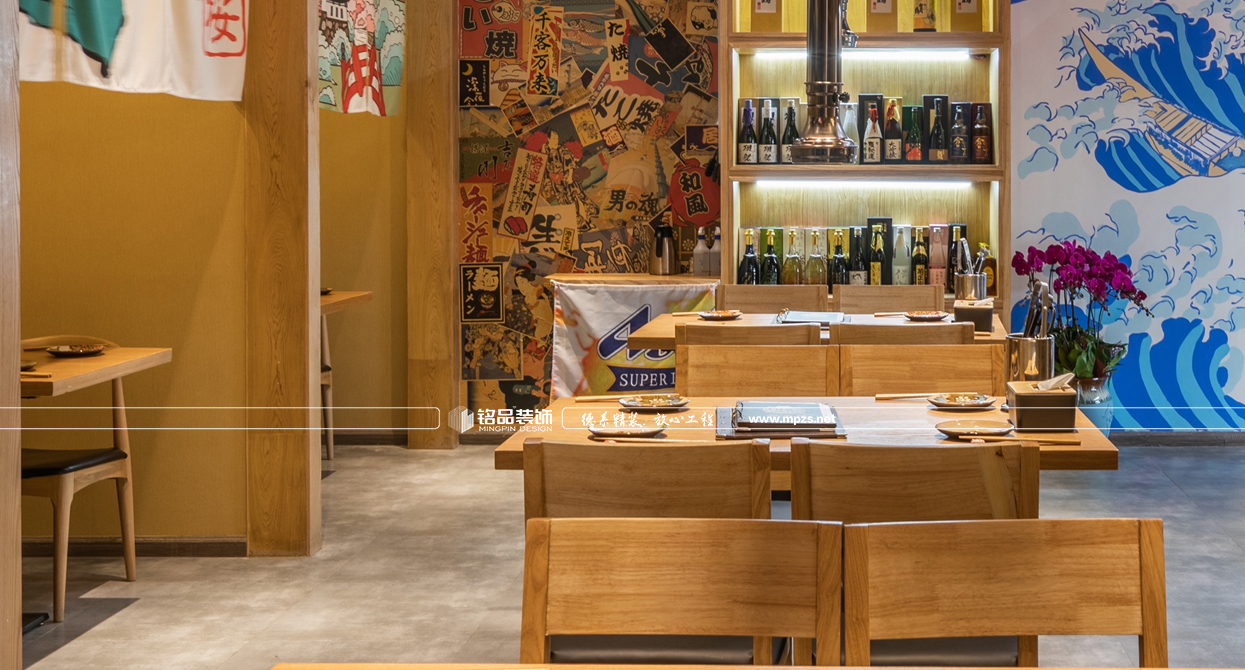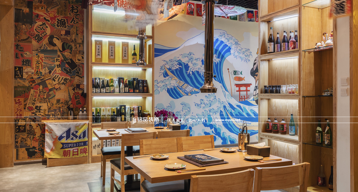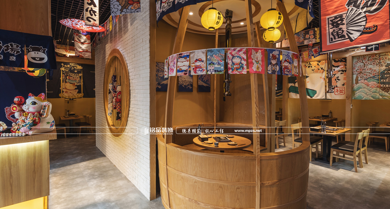 這套裝修案例位于杭州云臺國際中心,是一件日式料理燒烤店,設計師通過枯山水、日本武士等大量日式元素的運用來提升整個用餐環(huán)境的氛圍,一二樓使用升降梯便捷高效的送餐,墻面日本元素的墻繪