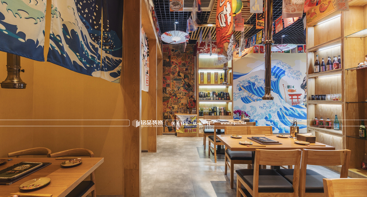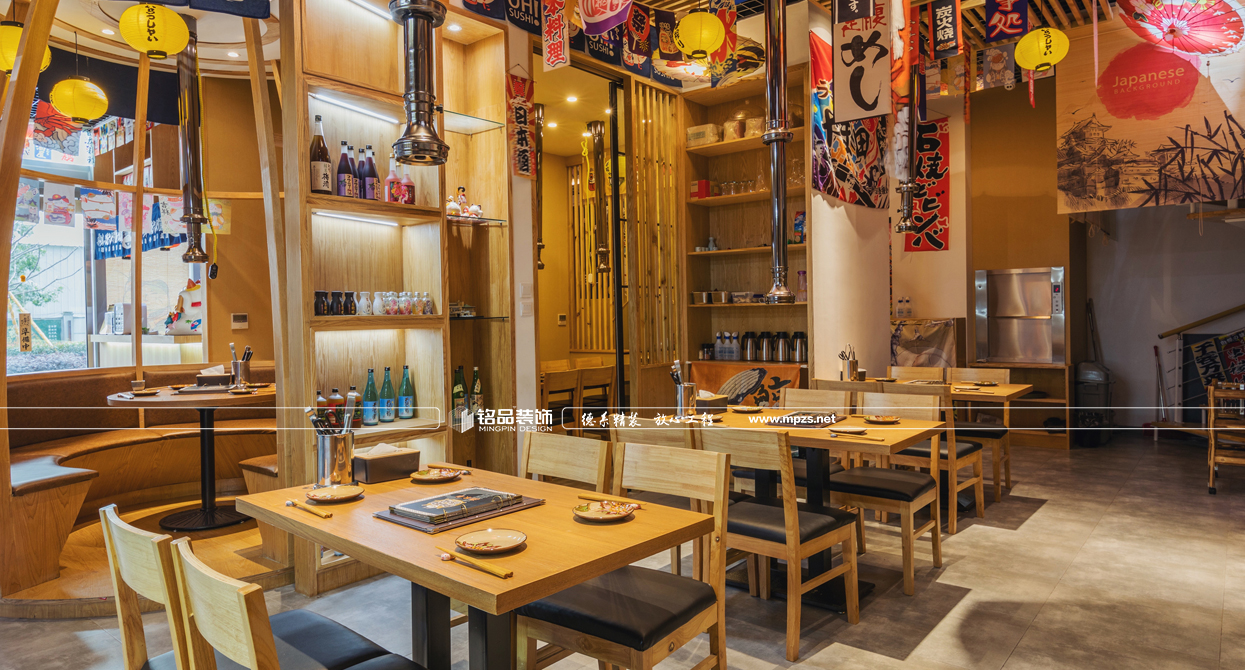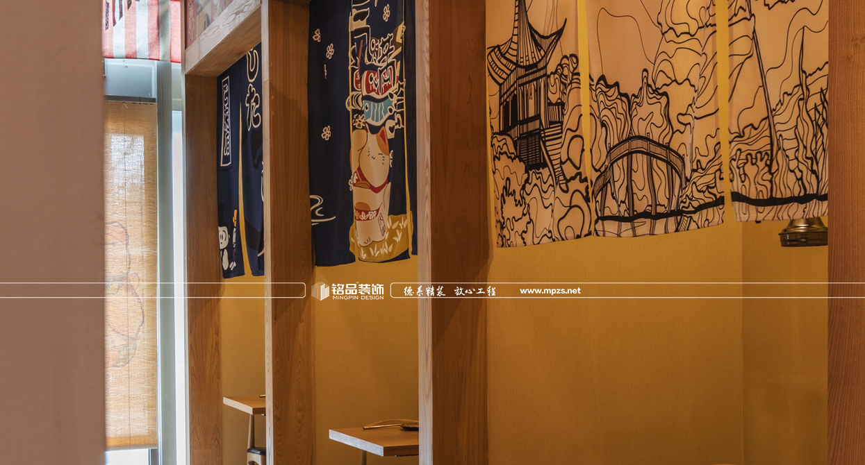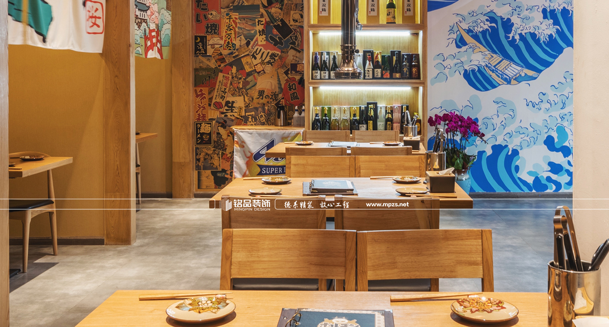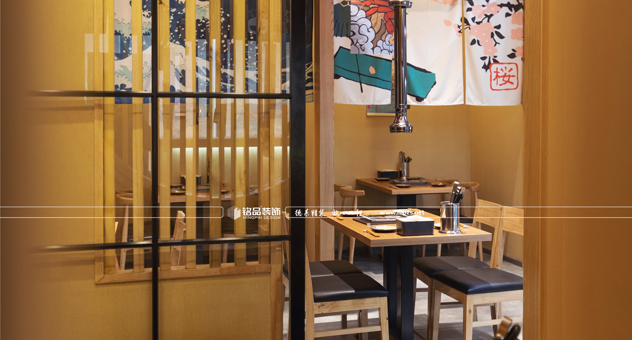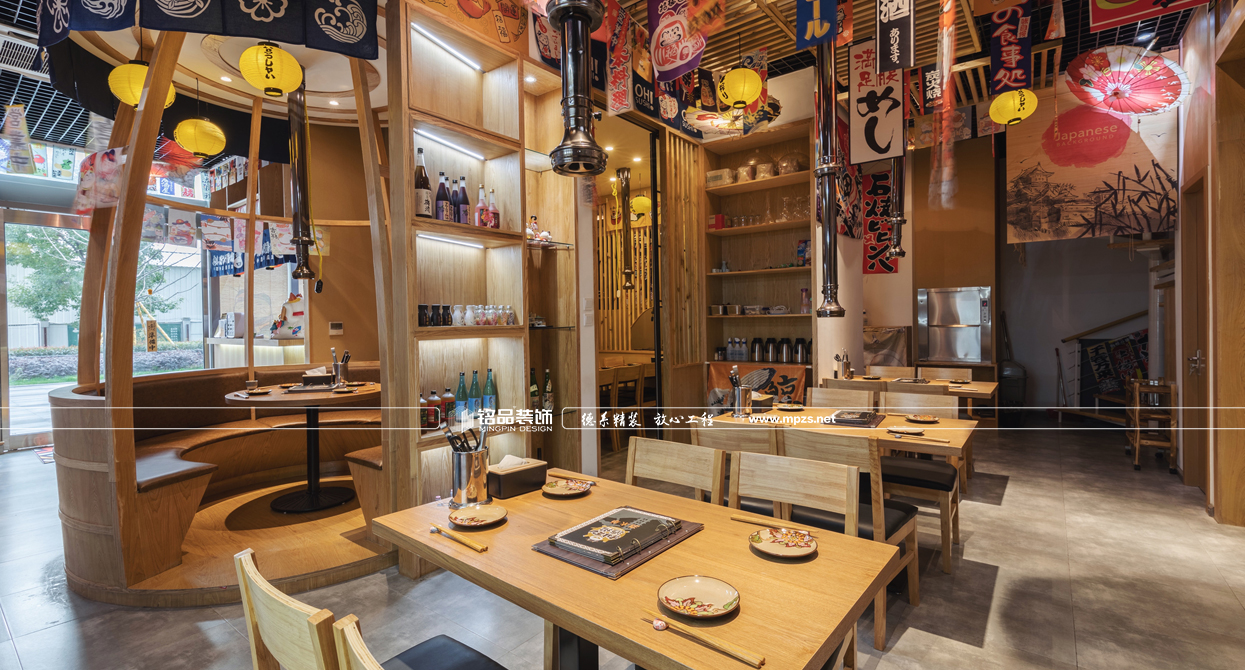 這套裝修案例位于杭州云臺國際中心,是一件日式料理燒烤店,設計師通過枯山水、日本武士等大量日式元素的運用來提升整個用餐環(huán)境的氛圍,一二樓使用升降梯便捷高效的送餐,墻面日本元素的墻繪