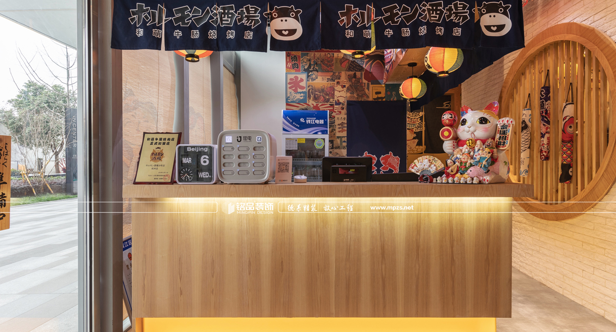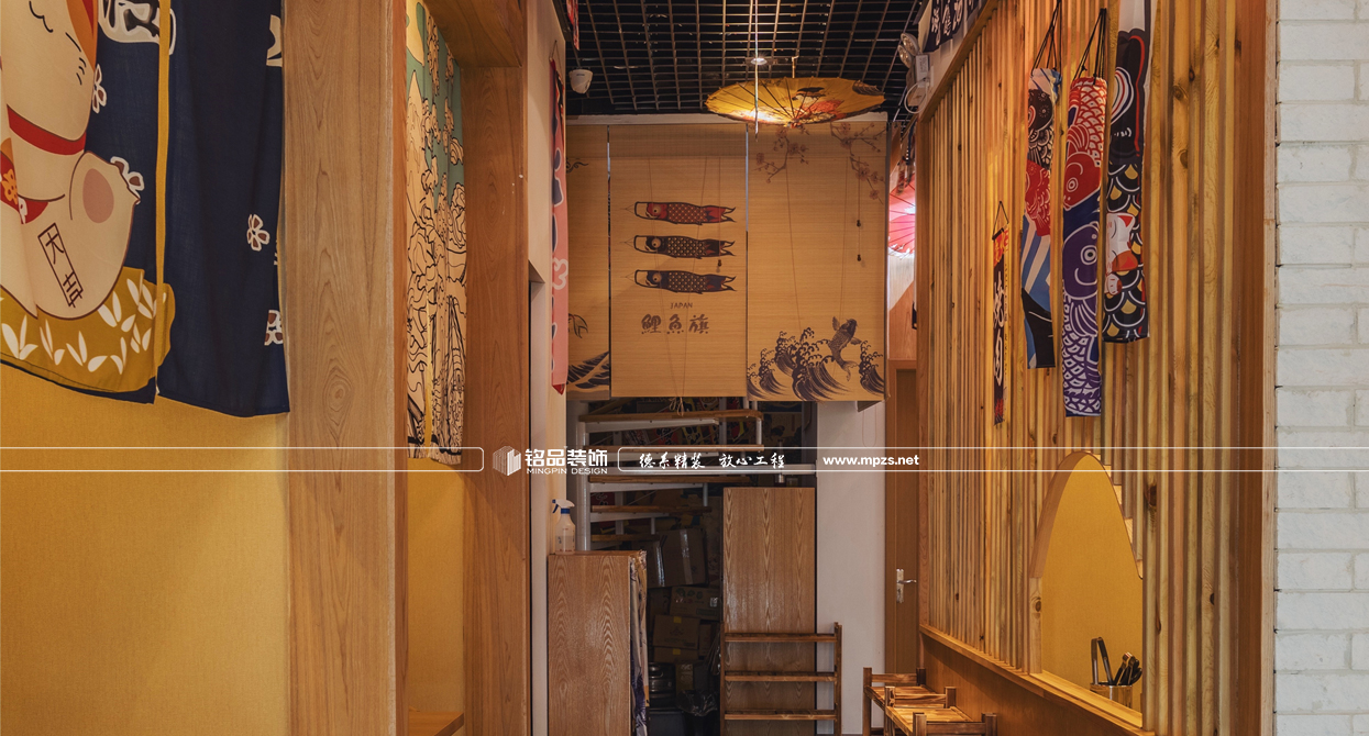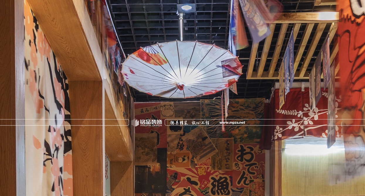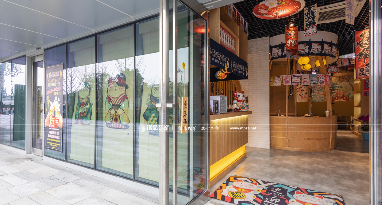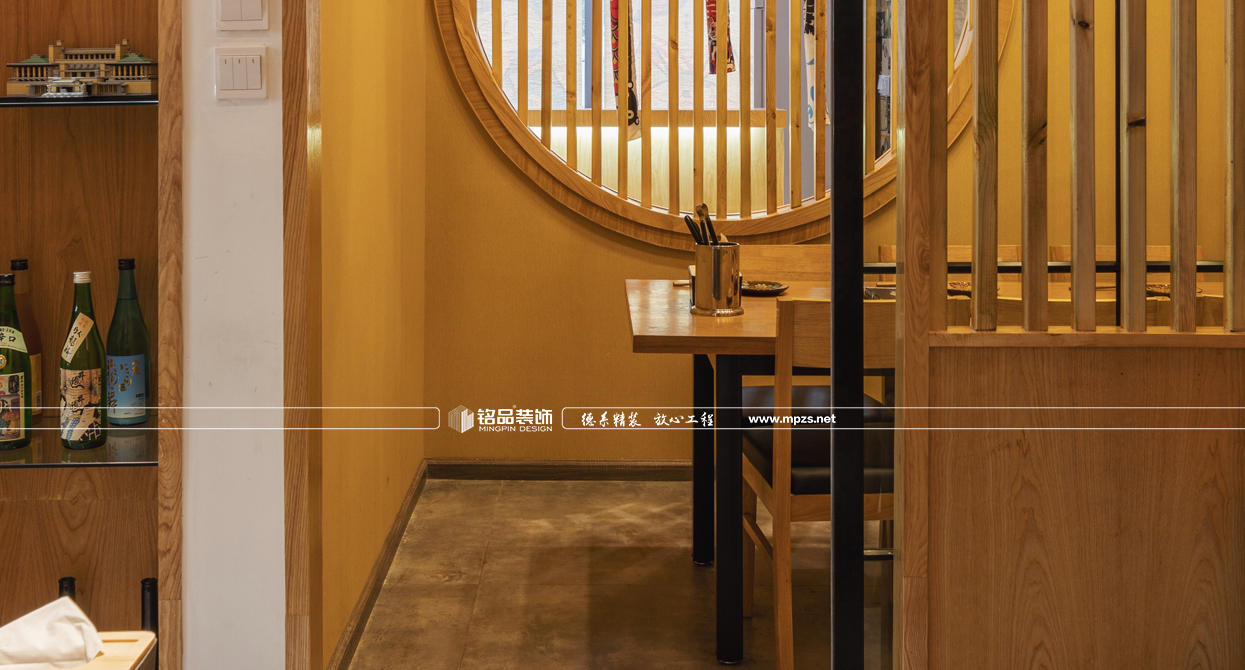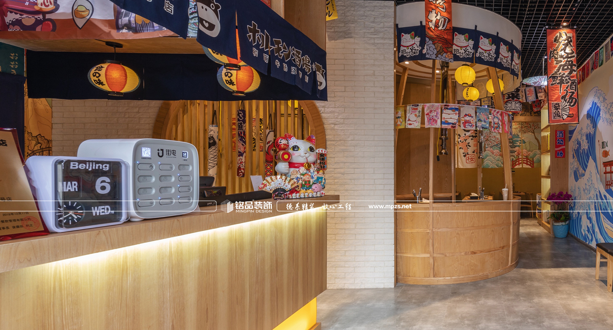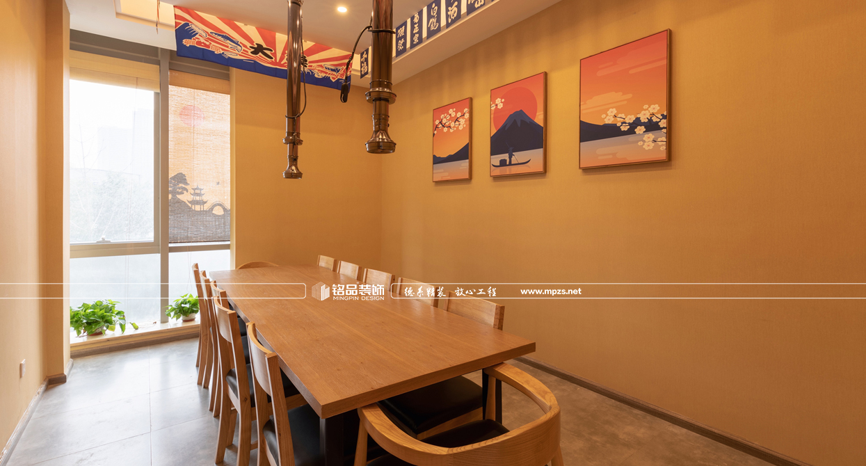 這套裝修案例位于杭州云臺國際中心,是一件日式料理燒烤店,設計師通過枯山水、日本武士等大量日式元素的運用來提升整個用餐環(huán)境的氛圍,一二樓使用升降梯便捷高效的送餐,墻面日本元素的墻繪